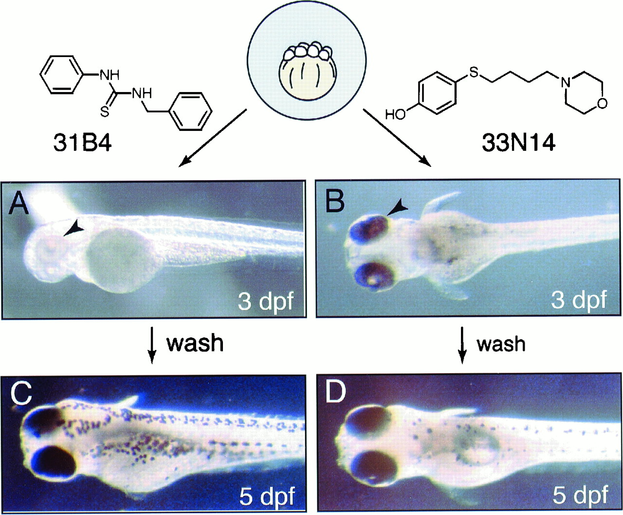 Fig. 3 Small molecules affect specific stages of pigment cell development. Zebrafish embryos were treated with 2 μg/ml of the small molecules 31B4 (A) or 33N14 (B) during the 3 dpf, after which the embryos were transferred to fresh water and allowed to grow for an additional 2 days in the absence of the small molecules (31B4 and 33N14 in C and D, respectively). The PRE is indicated by arrowheads.