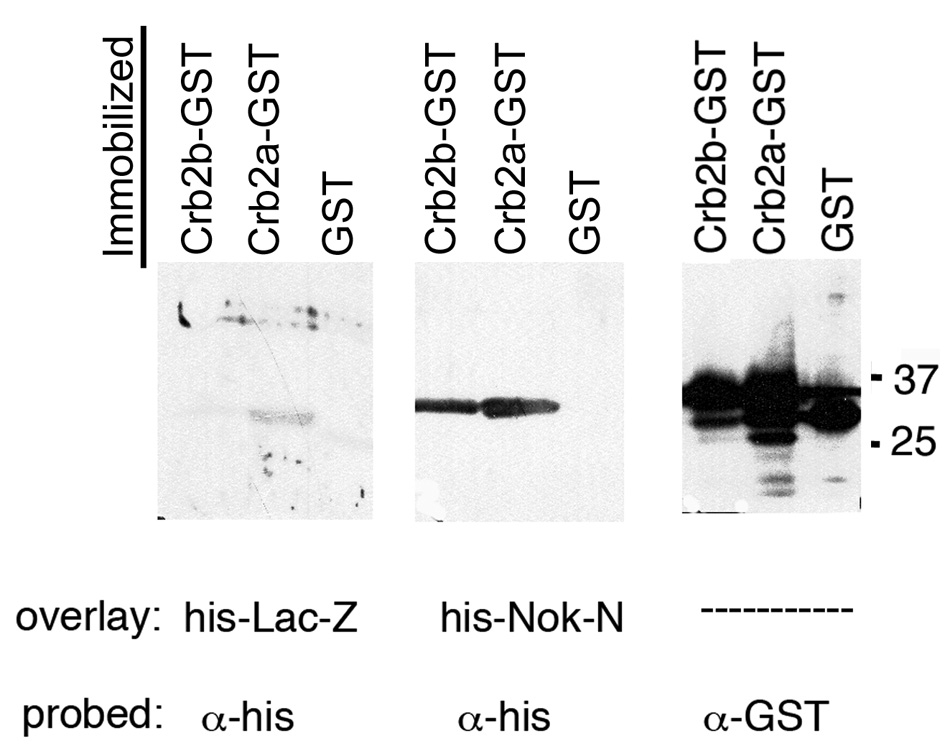 Fig. S3 Nok (Pals1) interacts directly with zebrafish Crumbs proteins. His-Nok-N binds to membrane-immobilized GST-Crb2a and GST-Crb2b but not to GST alone in a far western probed with anti-His. His-LacZ does not show significant binding to any of the GST fusions. Control loading comprises anti-GST western blot with 1/50th amount of GST-fusion proteins.