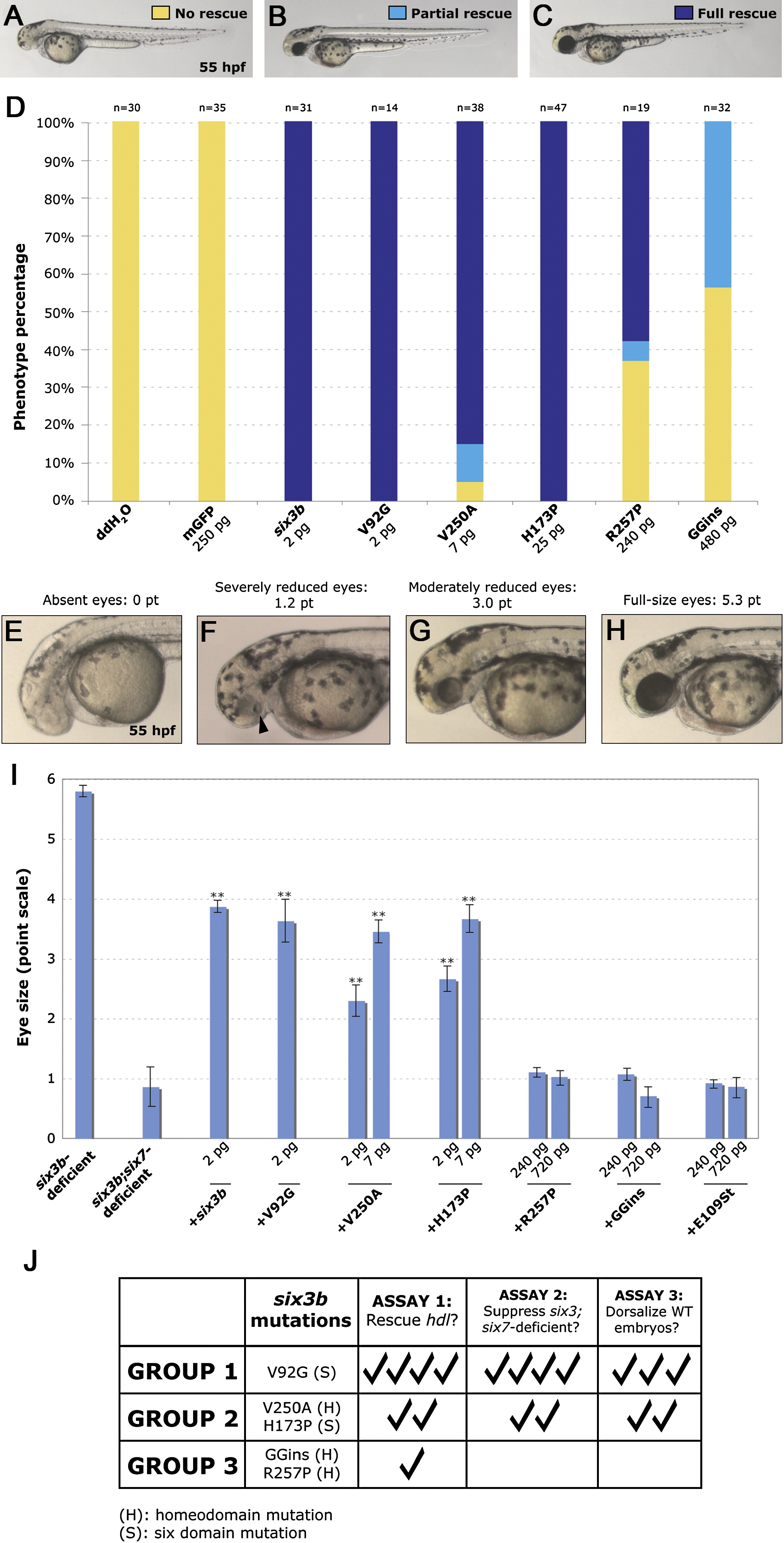 (J) Summary of the three zebrafish-based functional assays. Five HPE-associated Six3 mutants can be separated into three groups on the basis of their hypomorphic activity.