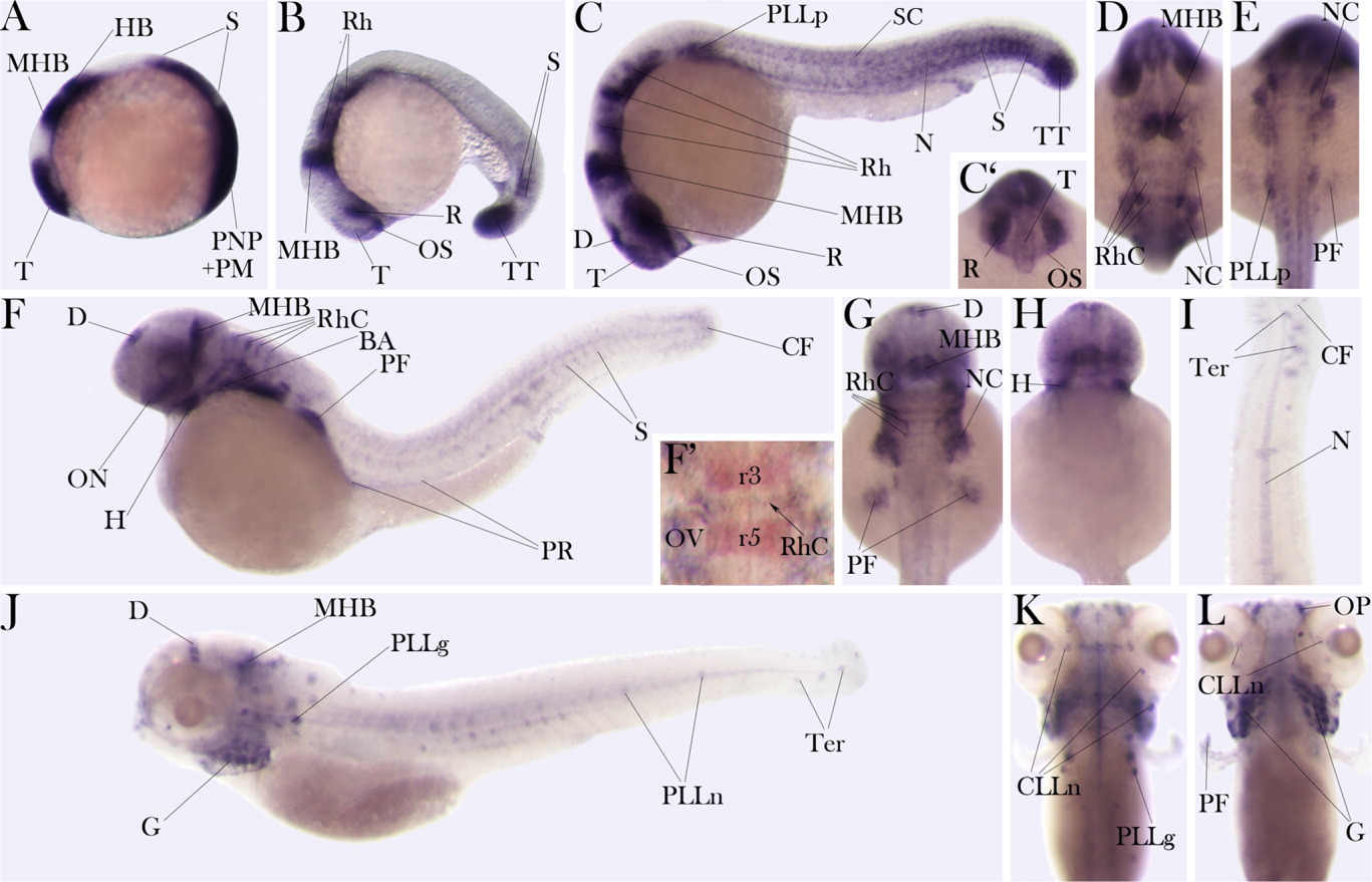 Fig. 2 In situ hybridization with spry1 antisense probe on wild-type embryos. A-L: At the 2-somite stage (A), 18-somite stage (B), 22 hours postfertilization (hpf; C-E,F′), 48 hpf (F-H), and 120 hpf (I-L). A-C,F,I,J: Lateral view, anterior to the left (I, anterior to the bottom); C′,H,L: ventral view, anterior to the top; D,E,F′,G,K: dorsal view, anterior to the top. spry1 expression domains are similar to the fgf8a expression pattern. Note in F′ (spry1-blue, ephA4-red marks r3 and r5) that rhombomere expression is not in register with rhombomere boundaries, but rather corresponds to rhombomere centers. BA, branchial arches; CF, caudal fin fold; CLLn, cranial lateral line neuromasts; D, dorsal diencephalon; G, gills, H, hyoid; HB, hindbrain; MHB, midbrain-hindbrain boundary; N, notochord; NC, neural crest; ON, optic nerve; OP, olfactory placodes; OS, optic stalk; OV, otic vesicle; PF, pectoral fin; PLLg, posterior lateral line ganglion; PLLn, posterior lateral line neuromasts; PLLp, posterior lateral line primordium; PM, paraxial mesoderm; PNP, posterior neural plate; PR, pronephros; S, somites; SC, spinal cord; R, retina; Rh, rhombomeres; RhC, rhombomere centers; T, telencephalon; Ter, terminal neuromasts; TT, tail tip.