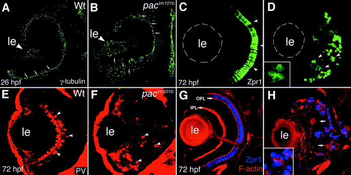 Fig. 4 Phenotype of the pactm101b mutant allele. pactm101b produces defects in the retinal neuroepithelium and in the organization of retinal neurons. In wild-type retinal neuroepithelium, all centrosomes are positioned apically at 26 hpf (A). By contrast, the centrosomes of pactm101b mutant retina are scattered along the apicobasal axis of the neuroepithelium in the ventral portion of the eye cup (vertical arrows in B), while the dorsal retina appears unaffected (horizontal arrows in B). At 3 dpf, photoreceptor cells of pactm101b mutant animals are scattered throughout most of the retina (arrowheads in D), while their wild-type counterparts form a uniform layer (arrowheads in C). Ectopic photoreceptors adhere to each other forming clusters, rosettes (inset in D). Parvalbumin-positive amacrine cells localize to ectopic positions in pactm101b retina (arrowheads in F). In wild-type zebrafish larvae, these cells form a layer in the center of the retina (arrowheads in E). Neuronal processes of the zebrafish retina form two uniform layers that strongly stain with phalloidin: outer plexiform layer (OPL) and inner plexiform layer (IPL) (arrows in G). In the retinae of pactm101b/tm101b mutants, neuronal processes form disorganized patches instead of layers (arrows in H). The lens, “le”, is outlined with dashes in (C) and (D). All panels show transverse cryosections through the retina stained with the following reagents: anti-γ- tubulin antibody (A, B), Zpr-1 antibody (C, D, G, H), anti-parvalbumin antibody (E, F), and phalloidin (G, H). In all panels, dorsal is up.