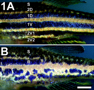 Fig. 1 Wild-type and puma mutant adult zebrafish. (A) Wild-type fish develop a series of alternating light and dark horizontal stripes. Dark stripes include melanophores, iridophores, and occasional xanthophores (Parichy and Turner, 2003b). Light stripes include xanthophores, iridophores, and occasional melanophores. Primary adult melanophores stripes develop during pigment pattern metamorphosis immediately dorsal (1D) and ventral (1V) to a lighter interstripe region. During terminal stages of metamorphosis, dorsal melanophores population develop scales (S) and contribute a dark cast to the dorsum of the fish. At the end of pigment pattern metamorphosis, additional secondary adult melanophores stripes start to form, initially ventral to the first ventral primary melanophore stripe (2V1), and then both dorsally (2D) and ventrally (2V2), until on average five stripes are present. (B) In puma mutants, melanophore numbers are severely reduced during early and middle stages of pigment pattern metamorphosis, and adult melanophores typically only appear during stages corresponding to the terminal phase of pigment pattern metamorphosis in wild-type fish. Normal primary stripes do not form, but as new melanophores appear late in development and cover dorsal scales (S), a striped pattern is partially recovered, yielding a pattern of regulatory melanophore stripes (R) that varies in completeness. Scale bar, 2 mm.