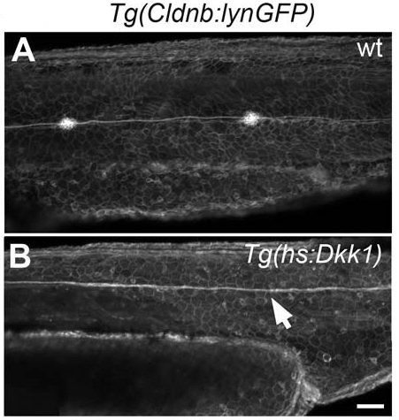 (B) Heatshocking Tg(hs:Dkk1) primordia at 26hpf leads to loss of posterior neuromasts at 48 hpf without affecting migration evidenced by the presence of the lateral line nerve (white arrow).