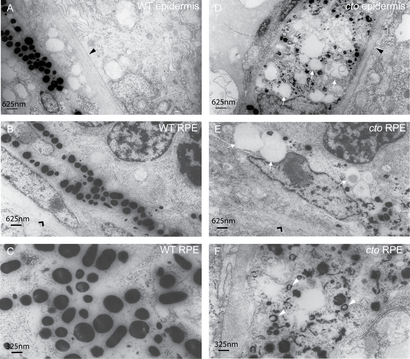 (A–B) Wild-type epidermal (A) and retinal pigment epithelial (RPE, B) melanocytes are elongated and thin and contain many large, densely pigmented melanosomes. The epithelial basement membrane is indicated by a black triangle in (A) and the RPE basement membrane by a black arrowhead in (B). (C) A higher magnification of wild-type melanosomes showing significant pigmentation and ellipsoid shape when cut longitudinally. (D–E) cto mutant epidermal (D) and RPE (E) melanocytes showing rounded, poorly pigmented cells that contain numerous large, empty vesicles (white arrows) The basement membranes are indicated as in (A and B). (F) A higher magnification of RPE melanosomes showing the diverse array of immature, poorly pigmented vesicles. The white arrowheads point to multi-lamellar, melanin filled vesicles which are identical to the melanin positive multi-vesicular bodies seen in the cappucino mouse (see text).