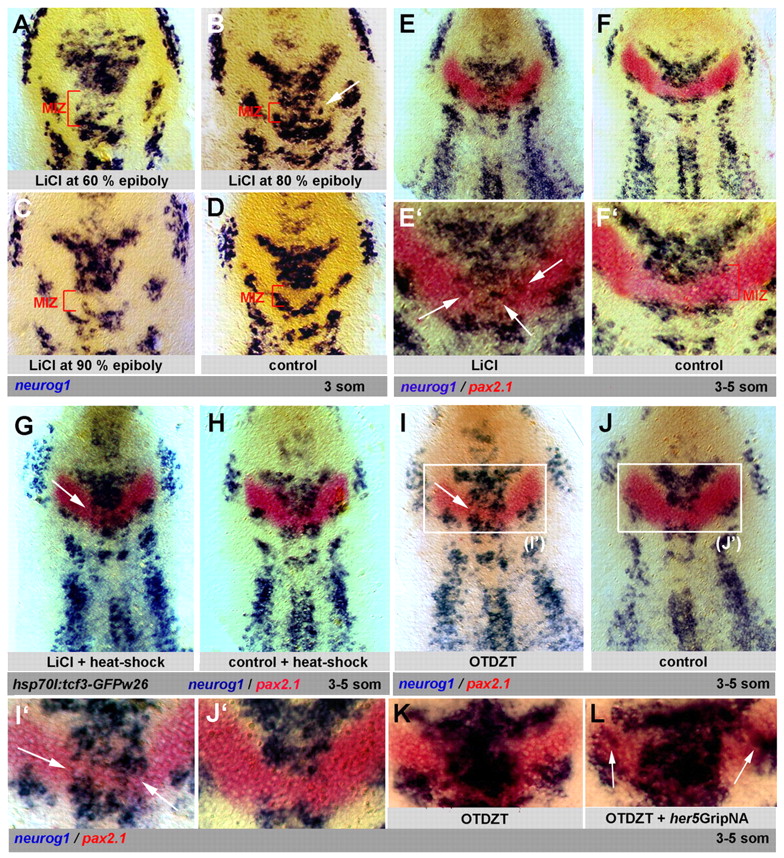 Fig. 2 LiCl enhances neurogenesis in place of the IZ independently of canonical Wnt signaling and its effects are mimicked by Gsk3β inhibition. Zebrafish embryos analyzed at the 3- to 5-somite stage by in situ hybridization and flat-mounted, anterior up. (A-F′) Treatment with LiCl. At 80% epiboly (B,E,E′), treatment induces ectopic neurog1 expression in place of the MIZ (arrows in B,E′). LiCl posteriorizes the anterior neural plate when applied earlier (A), and is without effect when applied later (C). Bracket in A-D indicates the MIZ. (D,F,F′) Control. (G,H) Effect of LiCl applied at 80% epiboly (G, arrow) in transgenic hsp70l:tcf3-GFPw3 embryos expressing a dominant-negative Tcf3a upon heat shock. Expression of this transgene alone does not perturb IZ formation (H). (I-L) The Gsk3β inhibitor OTDZT triggers ectopic neurog1 expression in place of the MIZ (I,I′, compare with J,J′), and within the LIZ when Her5 activity is reduced by her5GripNA injection (L, arrows, compare with K).