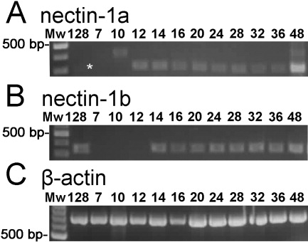 Fig. 4 RT-PCR analyses of zebrafish nectin-1a and nectin-1b. Expression levels of nectin-1a and nectin-1b were analysed at 128 cells, 7, 10, 12, 14, 16, 20, 24, 28, 32, 36, 48 hpf (marked above each sample) by RT-PCR (A, B) with β-actin as a reference (C). Mw: Fermentas GeneRulerTM 100-bp DNA Ladder. *Maternally contributed mRNA of nectin-1a.