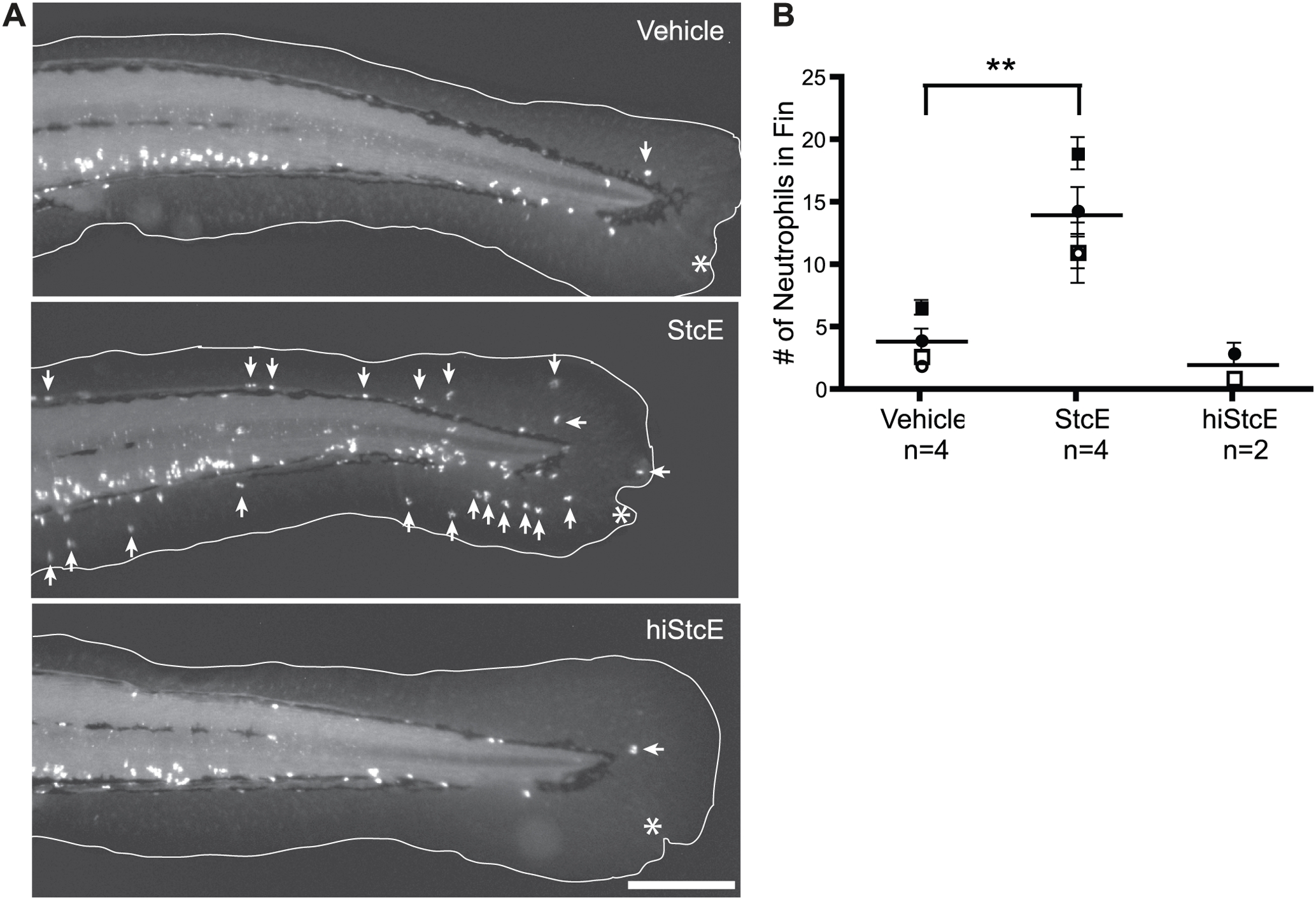 (A) Zebrafish embryos at 3 dpf were wounded in the ventral fin in the presence of 25 μg/mL StcE, hiStcE, or vehicle control and fixed after 24 hours for whole-mount immunofluorescence with anti-mpo staining. Arrows indicate abnormal localization of neutrophils in the fin of StcE-treated zebrafish. The edge of the fin is outlined in white, and the site of the wound is indicated by an asterisk. The scale bar represents 200 μm. (B) Images from independent experiments were blinded and the number of neutrophils in the fin counted. Data are shown as means of individual experiments (shapes)±S.E.M. and total combined mean (bars); **, p<0.01 of combined means by one-way ANOVA with Dunnett's post test.