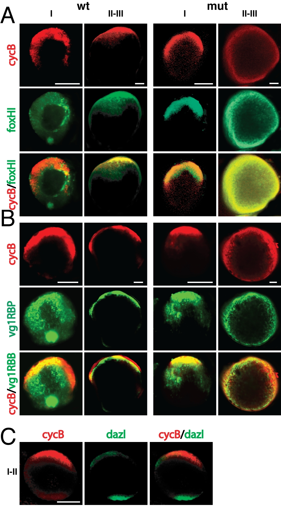 (C) CycB (red) and dazl mRNA (green) are localized at opposite poles at the end of stage I. Scale bar: 50 μm.