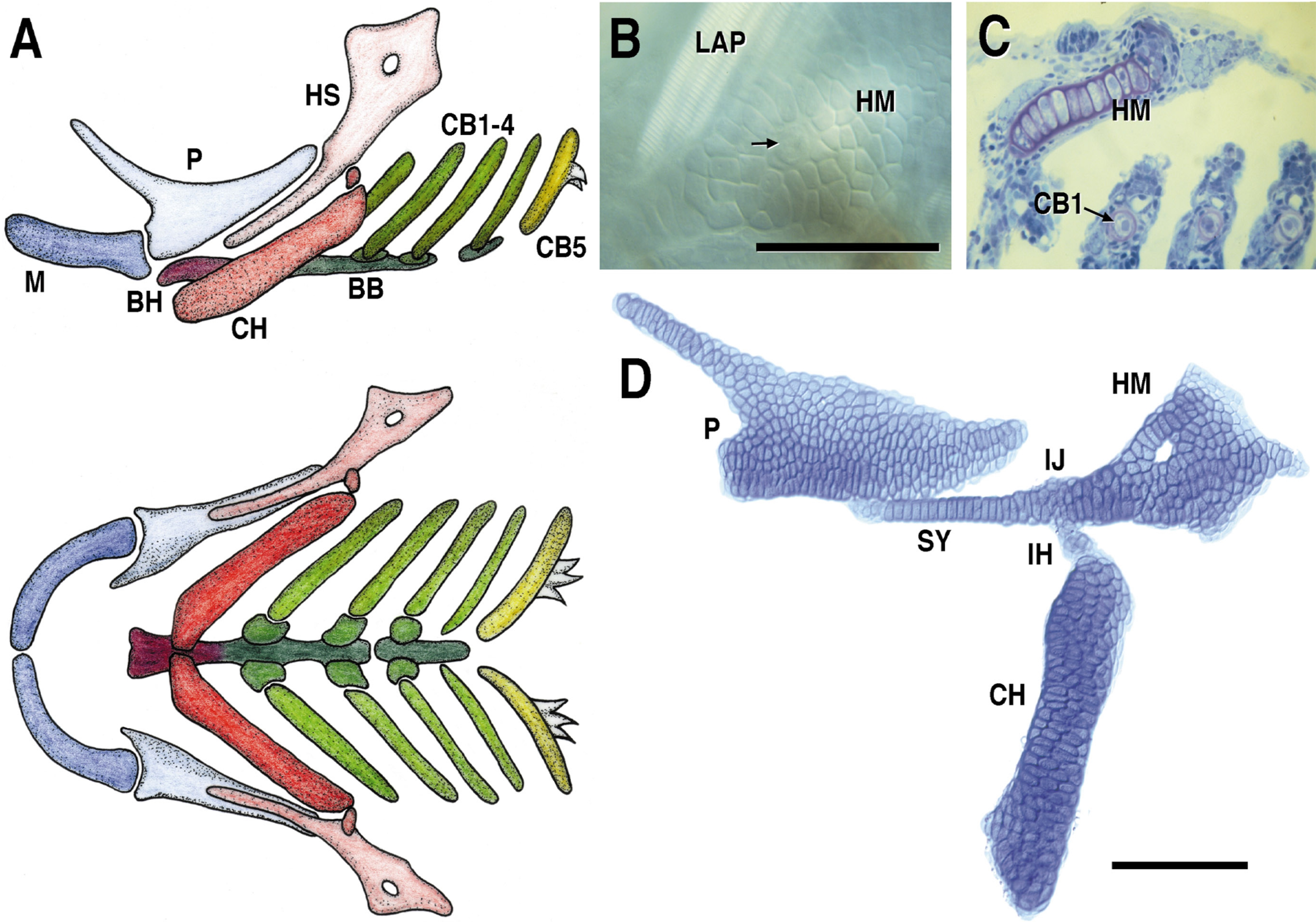 Fig. 1 Pharyngeal cartilages and their arrangements of chondrocytes. (A) Diagram of the segmental series of cartilages of the young larva, in a left-side view above (dorsal to the top and anterior to the left) and in a ventral view below. P and M are dorsal and ventral cartilages of the mandibular (first pharyngeal) arch (all abbreviations used in this paper are listed at the end of this legend). HS and CH are their putative homologues in the hyoid (second pharyngeal) arch. CB1-4 bear the set of four gills and CB5 (seventh pharyngeal arch) bears teeth. BH and BB are in the ventral midline (see Schilling and Kimmel, 1997 for a description of all of these cartilages and features of their development). (B) Dorsolateral surface view of the HM. Nomarski imaging in the live 5-day larva, revealing the mosaic-tile appearance of its cells. The arrow points to a nerve that passes through the hole in the HM, prominent in other figures (e.g., D), the hyomandibular foramen. Striated muscle fibers of LAP are also evident. Through-focus sectioning reveals that no chondrocytes are present above or below the plane of focus in the figure; there is only a single layer of them. (C) Horizontal Epon 7.5-μm section through the pharynx at 4 days, stained with methylene blue and basic fuchsin. Cartilage matrix is colored purple, the final magnification is the same as for B. The section passes through the HM, and through CB1–3. The HM cells in such sections have a low-columnar appearance; a view across such a plate of cartilage is rather like a view along a thinner rod of cartilage such as the SY (i.e., the view of the HM here is similar to the view of the SY in D). Sections across the rod-like cartilages, here illustrated for CB1–3, show disk-shaped single cellular profiles, revealing that the cartilages have the structure of a stack of coins or checkers. Irrespective of the form of the cartilages, or how the chondrocytes are arranged, the overlying, immediately adjacent layer of perichondrial cells is flattened onto the cartilage and forms a rather complete sheath. Perichondrial cell nuclei are more elongated and compact than chondrocyte nuclei. (D) Alcian green-stained cartilages, dissected out from a 5-day larva and flat-mounted (see Materials and Methods). The presentation shows all of the chondrocytes present in these cartilages, and their organization. They lie in rows, roughly parallel to the long axes of the cartilages (i.e., the rows run roughly horizontally in P, SY, and HM, and vertically in CH). Rows are not evident in the IJ. The method does not distort the cartilage shapes, but may disturb the articulations and the positional relationships between adjacent cartilages. Hence the in vivo positional relationships of these elements is better shown in A than D. Scale bars: 100 μm. Abbreviations: BB, basibranchial; BH, basihyal; CB1–5, ceratobranchials 1–5; CH, ceratohyal; HM, hyomandibular region of the HS; HS, hyosymplectic; IH, interhyal; IJ, interhyal joint region of the HS; LAP, levator arcus palatini muscle; M, Meckel’s; P, palatoquadrate; SY, symplectic region of the HS.