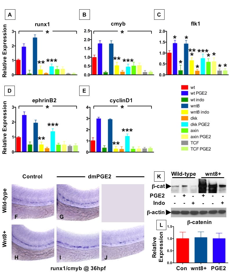 (K) Western blot analysis of total β-catenin in zebrafish embryo homogenates (12 embryos/lane) at 36 hpf. Induction of wnt8 as well as dmPGE2 treatment increased β- catenin, while indomethacin decreased levels in both wild-type and wnt8 embryos.