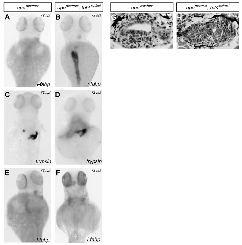 Fig. 4 Tcf4 depletion in apcmcr/mcr background rescues the expression of i-fabp, but not trypsin or l-fabp. Dorsal view of 72 hpf apcmcr/mcr (A, C, E) and apcmcr/mcr;tcf4exI/exI (B, D, F) siblings after WISH for i-fabp (A, B), trypsin (C, D), and l-fabp (E, F). Histological analysis of transversal sections from the foregut of 80 hpf apcmcr/mcr (G) and apcmcr/mcr;tcf4exI/exI (H) larvae stained with hematoxylin and eosin. Apc mutant embryos fail to develop properly polarized enterocytes, whereas in the double-mutant embryos this defect is rescued.