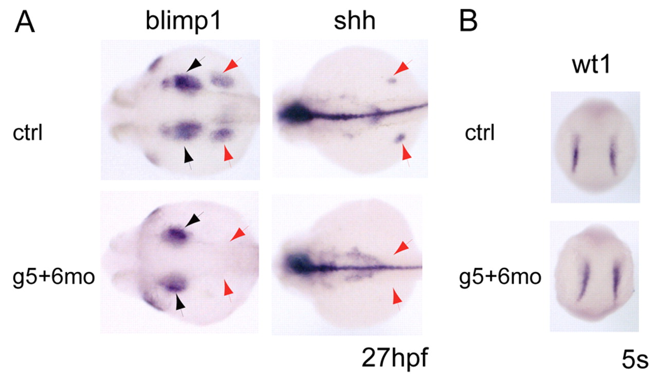 Fig. 6 Fate of ALM cells in gata5 and gata6 morphants. (A) Fin buds are lost in gata5 and gata6 morphants, as seen by the loss of blimp1 and shh expression (red arrows). Pharyngeal endoderm is slightly reduced in morphants (blimp1, black arrows) compared with wild type. (B) Pronephric mesoderm (wt1 expression) remains unchanged in gata5 and gata6 morphants at 5 somites.