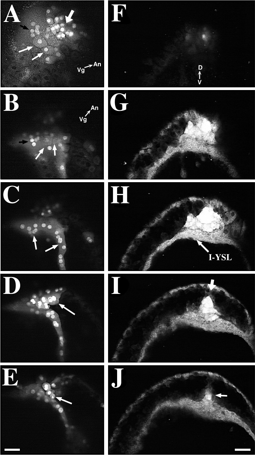 Fig. 3 The forerunner cell cluster forms a wedge-shaped cap at the posterior limit of the embryonic axis during late-epiboly. Scale bars, 50 μm. (A–E) The forerunner cells form a wedge-shaped cap at the dorsal margin of the blastoderm. EVL cells, which derive from the original NEM cell cluster, overlie the forerunner cells. Forerunner cells are derived from deep NEM cells. The embryo is viewed from its dorsal side. The embryo was stained with SYTO-11 and red-emitting BODIPY 564/591 at 30%-epiboly and then imaged at 65%-epiboly. Scale bar, 50 μm. (A) SYTO-11-labeled cells include both EVL – NEM cells (thin white arrows) and deep (forerunner) cells (thick arrow). A group of brightly labeled nuclei (black arrow) in the YSL is located just vegetal to the NEM/forerunner cluster margin. This surface-view image was taken by using a dual excitation with 488- and 568-nm laser light, while fluorescence emission was collected >585 nm. Since SYTO-11 exhibits a red fluorescence, dual excitation of the specimen allows cell nuclei and endosomes, labeled with SYTO-11, and cellular cytoplasm, labeled with BODIPY 564/591, to be imaged simultaneously. The animal-vegetal (An-Vg) axis is shown. (B-E) A focus-through of the NEM/forerunner cell cluster in the same embryo as in F but rotated slightly counterclockwise and shifted into an oblique orientation. B-E were only collected with 488-nm excitation so that only SYTO-11 emission is seen. (B) This is a surface focal plane of the NEM/forerunner cell region showing the same EVL (white arrows) and YSL nuclei (black arrow) shown in A. (C) 15 μm deeper than B. Brightly labeled YSL nuclei (arrows are visible at this plane of focus. (D) 23 μm deeper into the embryo. Brightly labeled, multi-nucleate EVL-NEM cells (arrow) lie directly above the forerunner cell cluster. (E) 23 μm deeper into the embryo. SYTO-11-labeled deep cells (arrow) of the forerunner cell cluster are closely associated to overlying EVL-NEM cells. Panels F-J show a focus-through (15-μm steps) of a 80%-epiboly-stage embryo labeled with SYTO-11, starting from the posterior edge of the NEM/forerunner cell cluster and progressing toward the anterior end of the cell cluster. The embryo is viewed from the vegetal pole. The dorsal-ventral (D-V) axis is shown. (F) The focus-through starts at the level of the EVL-YSL boundary. (G) Labeled NEM/forerunner cells and YSL cytoplasm are prominent. (H) A distinct layer of forerunner cells lies directly above the internal YSL which contains numerous SYTO-11-filled endosomes. (I, J) Edges of the germ ring converge toward the embryonic midline which is defined by the dorsal apex (arrow) of the forerunner cell cluster. The NEM cell cluster in J also has an apex (arrow) pointing toward the anterior end of the embryo. The anterior apex of the forerunner cluster lies in a more ventral plane than the dorsal apex seen in H.