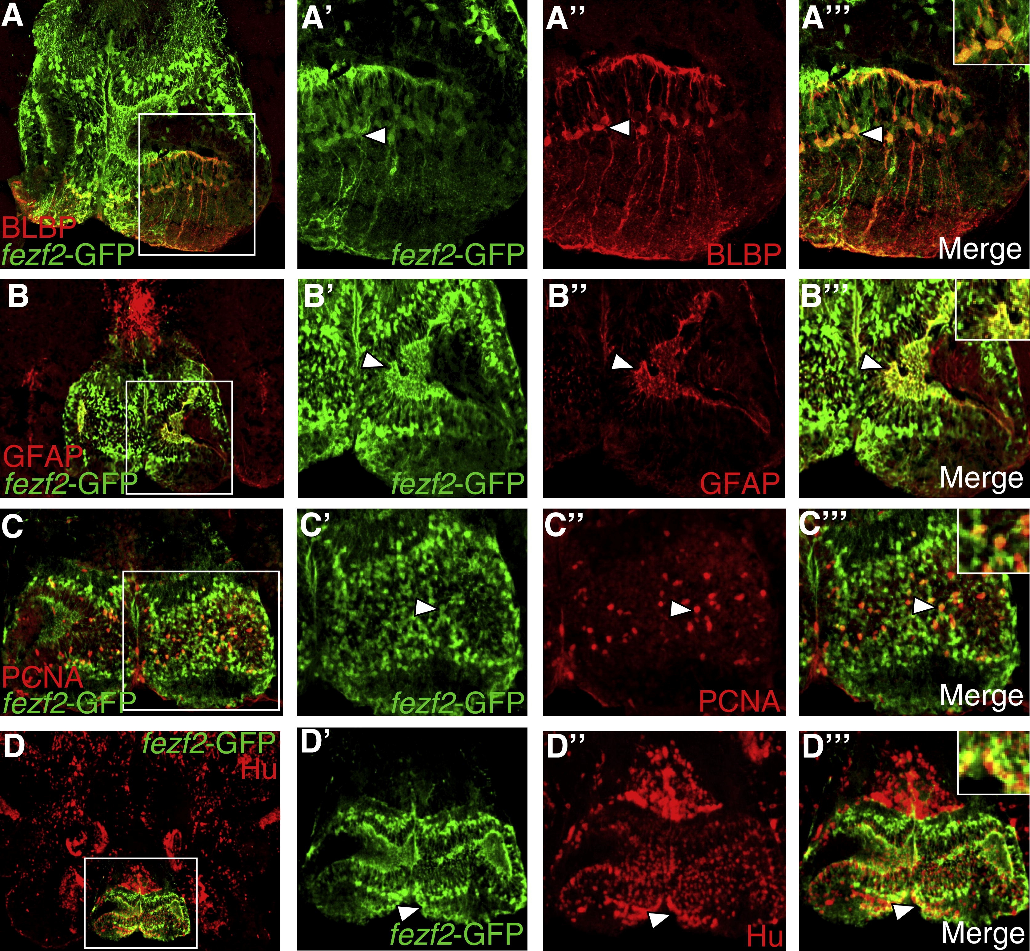 Fig. 6 fezf2-GFP expression suggests adult neurogenesis in the caudal hypothalamus. (A) Coronal section through hypothalamus showing double-labeling of fezf2-GFP (green) and BLBP (red) (40x magnification). (A′–A″′) Closer view of the boxed region shows that some fezf2-GFP+ cells colocalize with neural stem cell marker BLBP and have radial glial morphology (arrowhead). (A″′) Inset shows colocalization in cells (depicted by arrowhead) at higher magnification. (B) Double-labeling of fezf2-GFP (green) and neural stem cell marker GFAP (red) (40x magnification). (B′–B″′) Closer view of boxed region shows colocalization in some cells (arrowhead). (B″′) Inset shows colocalization in cells at higher magnification. (C) Double-labeling of fezf2-GFP and proliferating cell marker PCNA (40x magnification). (C′–C″′) Closer view of boxed region shows colocalization in some cells (arrowhead). (C″′) Inset shows colocalization in cells at higher magnification. (D) Double-labeling of fezf2-GFP and neuronal marker Hu (20x magnification). (D′–D″′) Closer view of the boxed region shows colocalization of some fezf2-GFP+ cells with Hu (arrowhead). (D″′) Inset shows colocalization in cells at higher magnification.