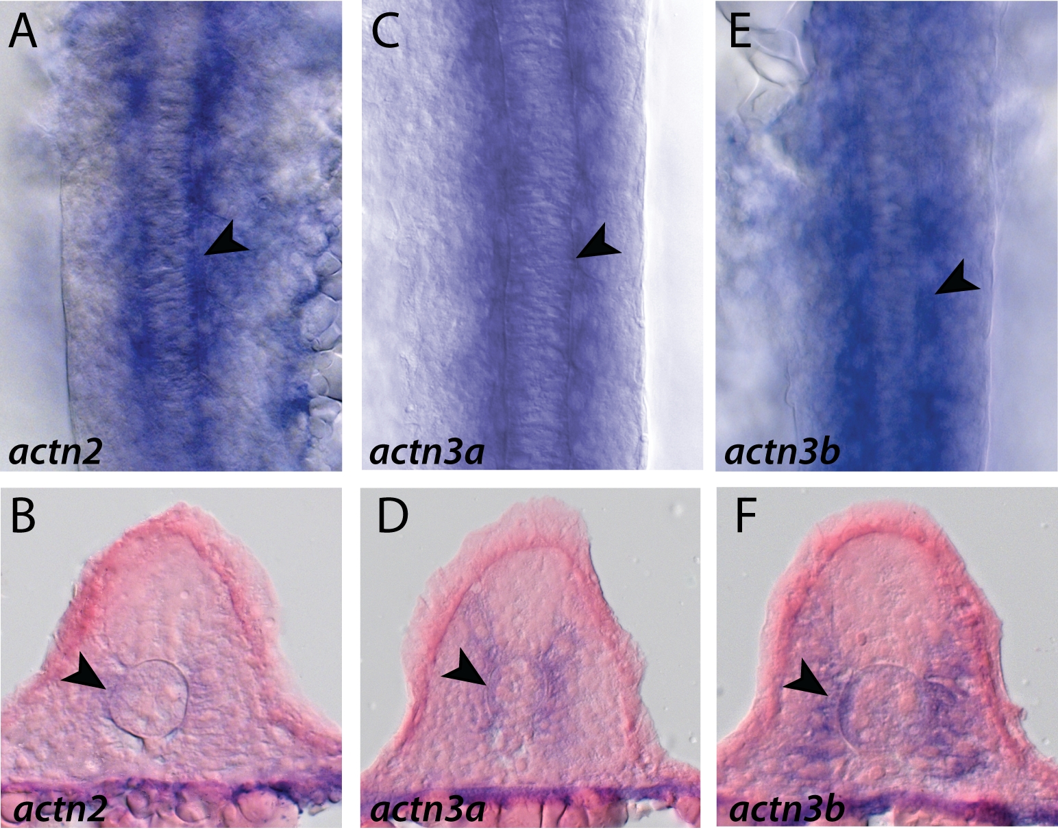 Fig. S3 Expression of the muscle actinins at 15 somites as shown by in situ hybridization. A, C, E: Dorsal views of 15 somite flatmounted embryos. B, D, F: Transverse sections taken at a level between somites 5 to 10. A-F: Expression of all three muscle actinins can be observed in the adaxial cells adjacent to the notocord (arrowheads). actn3a and actn3b are expressed more strongly and in a domain that has expanded slightly more dorsolaterally and ventrolaterally than actn2 at 15 somites (D,F).