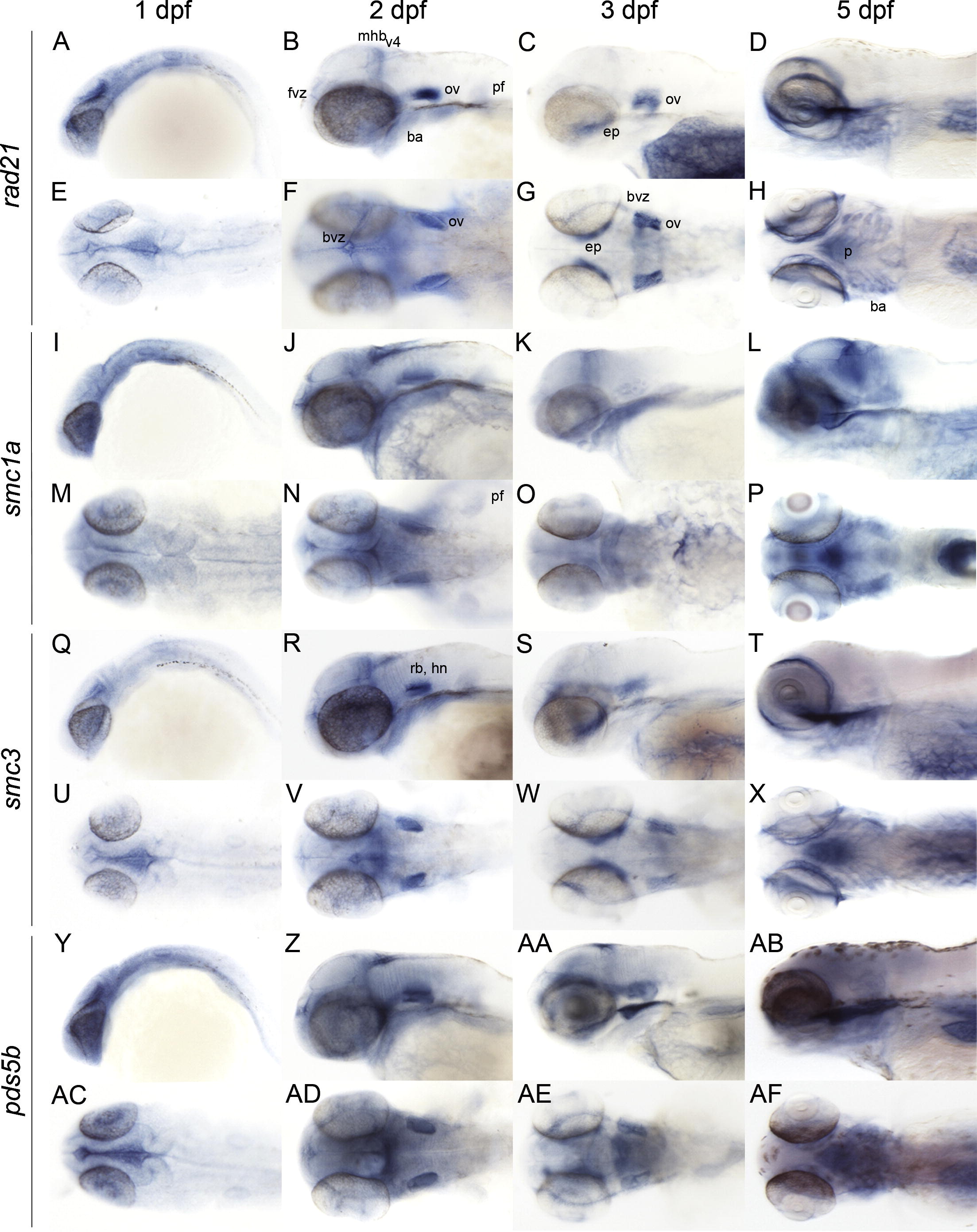 Fig. 2 Late embryonic and larval expression (1–5 dpf) of genes encoding zebrafish cohesin subunits. Whole mount in situ hybridization of zebrafish at the indicated stages with antisense riboprobes detecting the following mRNAs: (A–H) rad21. (I–P) smc1a. (Q–X) smc3. (Y–AF) pds5b. A–D, I–L, Q–T, Y–AB: lateral views. E–H, M–P, U–X, AC–AF: dorsal views. Anterior is to the left for all. ba, branchial arches; bvz, brain ventricular zone; ep, ethmoid plate; fvz, forebrain ventricular zone; hn, hindbrain neurons; mhb, midbrain hindbrain boundary; ov, otic vesicle; p, pharynx; pf, pectoral fin; rb, rhombomeres boundaries; v4, 4th ventricle.