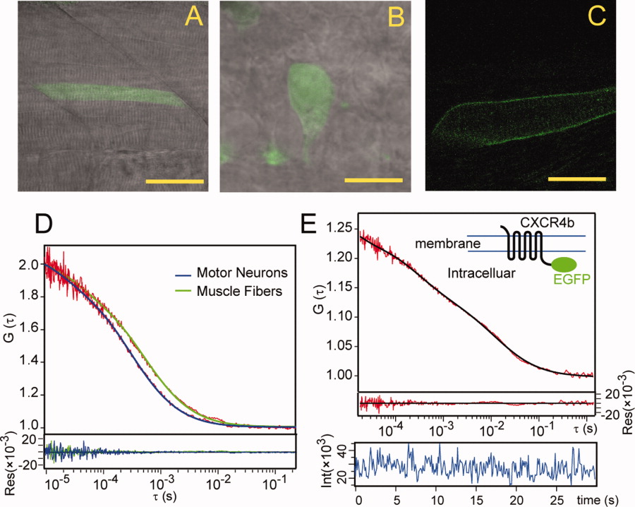 Fig. 5 Diffusion coefficient measurements in zebrafish embryos. A,B: Confocal images of enhanced green fluorescent protein (EGFP) expressed muscle fibers (at posterior trunk region) and motor neurons (at hindbrain/spinal cord junction region), respectively. Lateral view. C: Confocal image of Cxcr4b-EGFP-expressing muscle fiber, membrane expression pattern was observed. D: Normalized autocorrelation curves of cytosolic EGFPs in muscle fibers and motor neurons. E: Autocorrelation and fitting curves of Cxcr4b-EGFP on membrane of muscle fibers, together with fitting residuals and fluorescence intensity trace. The inset is a schematic drawing of the construct. Scale bars = 40 μm in A, 10 μm in B, 20 μm in C.