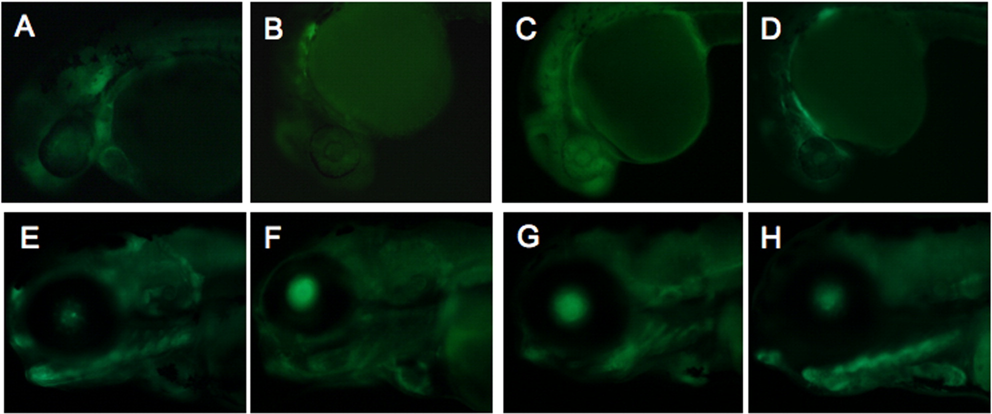 Fig. S4 Four independent transgenic lines for zCNS +88 show substantial similarity. Embryos from four founders display essentially similar patterns of expression at 1 dpf (A–D) and 4 dpf (E–F), including expression in heart and vasculature.