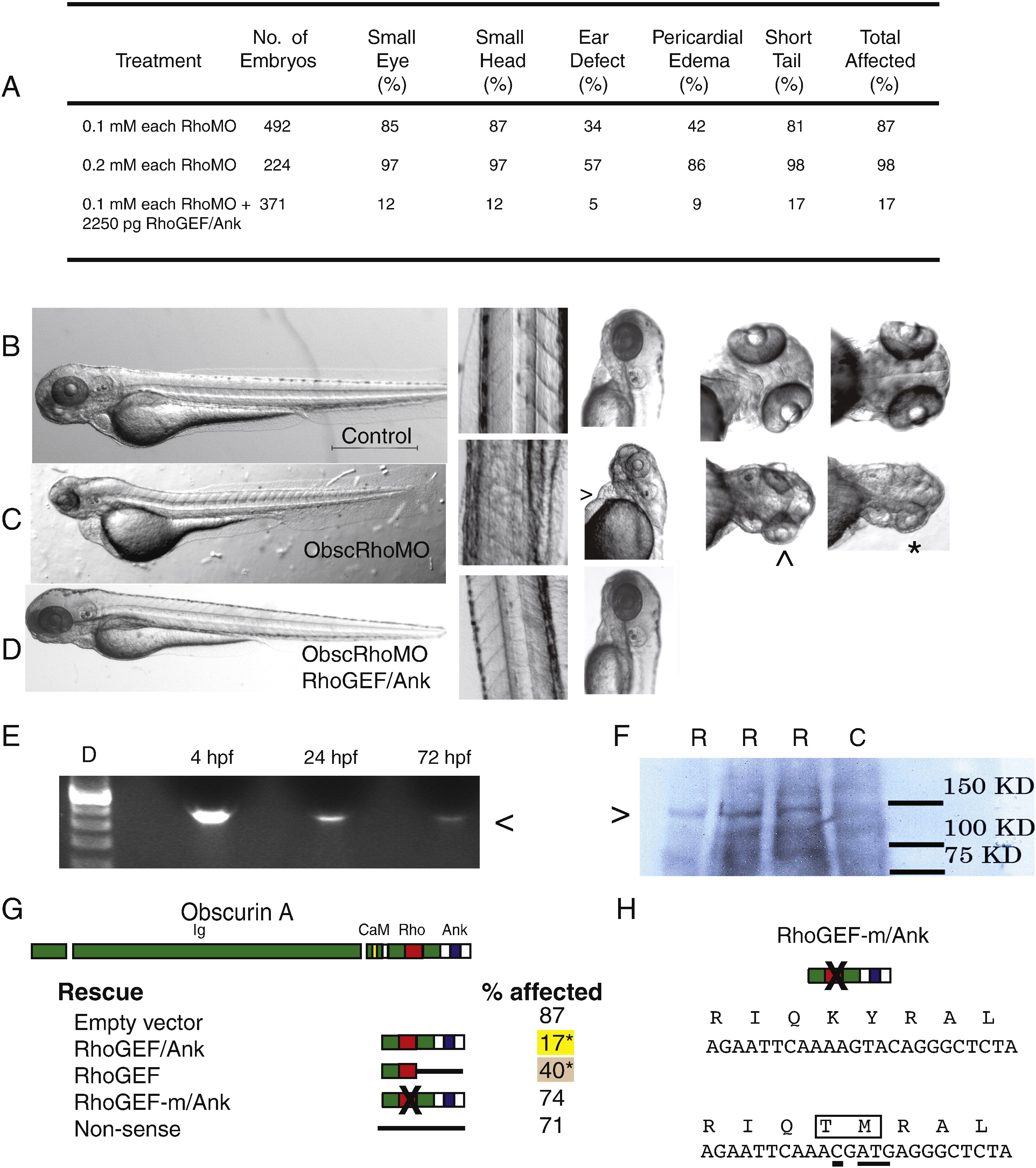 Fig. 2 Obscurin A RhoGEF morphant phenotype. (A) Morphant embryos were assessed at 72 hpf and scored for head size (small head), eye morphology (small eye, poorly developed optic cup), ear morphology (one or no otoliths), cardiac structure and function (ventricular hypoplasia or dilatation, pericardial edema) and skeletal muscle appearance (reduced tail length and width). (B–D) Gross morphology of control (B), obscurin A RhoGEF morphant (C) (0.1 mM of each morpholino), and rescued obscurin A RhoGEF morphant embryos (D) (0.1 mM of each morpholino + 2250 pg RhoGEF/Ank expression construct). The obscurin A RhoGEF morphant embryos demonstrate a high incidence of pericardial edema (>), moderate (^) to severe (∗) eye hypoplasia, and smaller heads than controls. These defects were rescued or markedly diminished by co-injection of an obscurin A expression construct that included the RhoGEF and ankyrin binding domains (RhoGEF/Ank). (E) RT-PCR of mRNA extracted from 4, 24 and 72 hpf embryos injected with the expression construct demonstrating correct amplification of the expression tag (<). (F) Western analysis (Ab: anti-EGFP) of 72 hpf whole embryo lysates demonstrating expression of a fusion protein (>) of the expected size only in injected embryos (R) and not in control (C). (G) Percentage of obscurin A RhoGEF morphant embryos demonstrating one or more of the phenotypic abnormalities upon co-injection with the indicated rescue construct (∗p < 0.05 compared to empty vector control). Note the high efficiency of rescue with the RhoGEF/Ank and the absence of rescue with the non-sense and RhoGEF-m/Ank constructs. (H) Diagram of the amino acid sequence change introduced into the RhoGEF-m/Ank construct that replaces a conserved KY (Lysine–Tyrosine) motif with TM (Threonine–Methionine). Underlined nucleotides were changed using site-directed mutagenesis.
