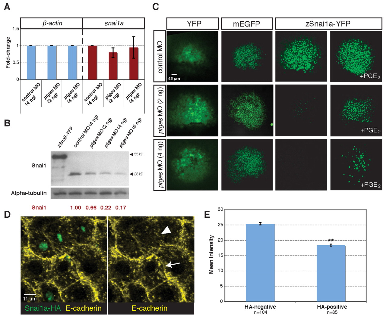 Fig. 4 PGE2 deficiency destabilizes Snai1a protein. (A) qRT-PCR of β-actin (left) and snai1a (right) transcript levels in control and ptges morphants at 60% epiboly. (B) Immunoblotting using antibodies against Snai1a (top) and α-tubulin (loading control, bottom) in control and ptges morphants. The first lane shows zebrafish embryos that were injected with snai1a-yfp (which encodes a protein of 55 kDa). (C) Confocal images of Snai1a-YFP, YFP, and membrane EGFP expression in control (top row) and ptges morphants (middle and bottom rows), and ptges morphants incubated with PGE2 (shield stage). (D) Confocal images of ptges morphant gastrulae (shield stage) stained with anti-HA (green) and anti-E-cadherin (yellow) that were mosaically injected with snai1a-HA RNA (3 pg) at the 8- to 16-cell stage. Compare the intensity of E-cadherin staining at the membranes between two HA-positive cells (arrowhead) with that between two HA-negative cells (arrow). (E) Quantitation of E-cadherin immunostaining intensity (mean intensity) of Snai1a-HA-negative and Snai1a-HA-positive cells in ptges morphant gastrulae. **, P=1.16x10-10.