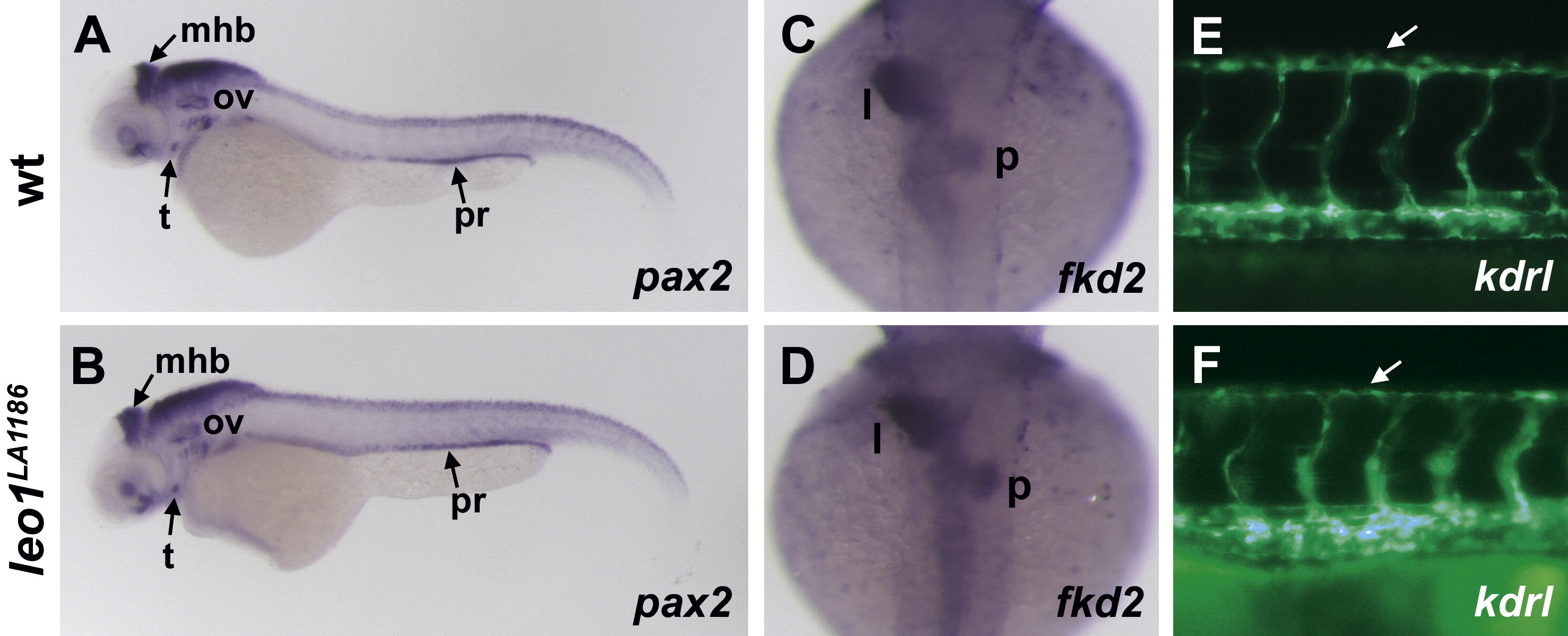 Fig. S1 Leo1LA1186 mutants do not have general developmental delay. (A, B) pax2 expression is detected in the midbrain–hindbrain boundary (mhb), thyroid (t), otic vesicle (ov), and pronephric ducts (pr) of wild-type embryos (A) at 50 hpf. Leo1LA1186 mutants have normal expression of pax2 in all of these structures at 50 hpf (B), indicating that the timely organogenesis of the brain, thyroid, otic vesicle, and pronephric ducts does not require Leo1 activity. (C, D) At 50 hpf, both wild-type (C) and leo1LA1186 mutant (D) embryos have a leftward-looped gut, liver (l), and pancreas (p) labeled by fkd2 staining, demonstrating that the morphogenesis of the gut is not developmentally delayed upon loss of Leo1 activity. (E, F) By 50 hpf, the primary intersegmental vessels have branched dorsally to form the dorsal longitudinal anastomotic vessel (arrows) in both wild-type (E) and leo1LA1186 mutant (F) embryos, suggesting that Leo1 activity is not essential for patterning of the trunk vasculature within a normal developmental timeframe. Vessels in E and F are visualized by fluorescence microscopy of Tg(kdrl:GFP)la116 transgenic embryos.