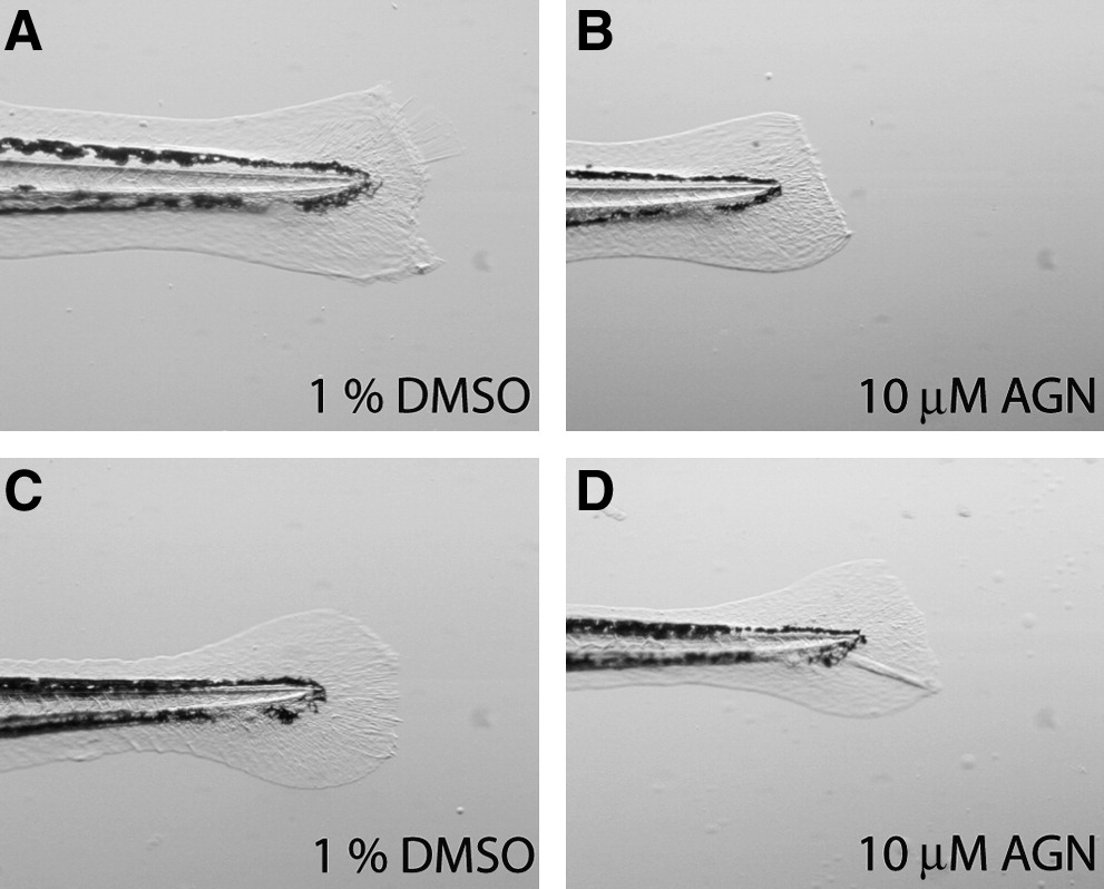 Fig. 7 AGN192403 inhibits fin fold regeneration. Larval fin folds were amputated (A, B) and then allowed to regenerate for 3 days (28.5°C) (C, D). (A, C) 1% DMSO alone had no effect on fin fold regeneration. (B, D) An example of inhibition of larval fin fold regeneration when larvae are treated with 10 μM AGN192403 following amputation of the fin fold.