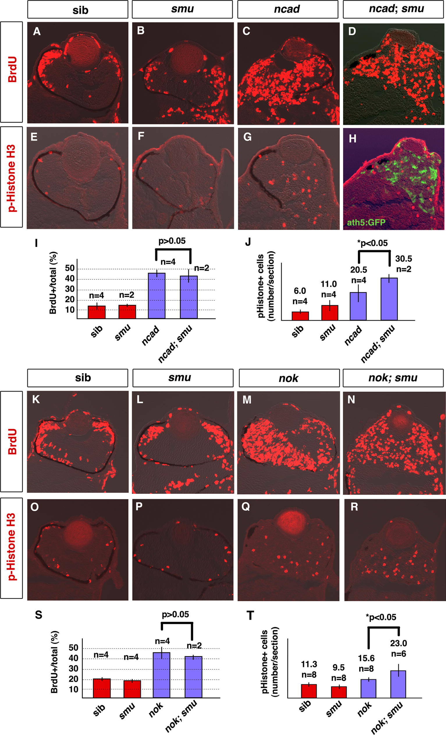 Fig. 6 smu mutation enhances defects of retinal neurogenesis in ncad and nok mutants. (A–D) BrdU incorporation in wild-type retina (A) and smu (B), ncad (C) and ncad; smu mutant retinas (D) at 48 hpf. (E–H) Labeling of wild-type (E), smu (F), ncad (G) and ncad; smu mutant retinas (H) with anti-pH3 antibody at 48 hpf. In the ncad; smu double mutant, the boundary between the neural retina and brain was often unclear. Thus, ath5:GFP expression (green) was visualized for demarcating the boundary between the neural retina and the brain (H). Adjacent retinal sections of the same ncad; smu double mutant embryo were used for the analyses of BrdU incorporation (D) and anti-pH3 antibody labeling (H). (I) Ratio of number of BrdU-positive cells to total number of retinal cells in wild-type retina and smu, ncad, and ncad; smu mutant retinas. There is no statistically significant difference in BrdU incorporation level between ncad and ncad; smu mutant retinas (p > 0.05; Student’s t-test). (J) Number of pH3-positive cells per sectioned retina of wild type and smu, ncad, and ncad; smu mutants. The number is higher in the ncad; smu double mutant retina than in the ncad single mutant retina (*p < 0.05: Student’s t-test). (K–N) BrdU incorporation in wild-type retina (K) and smu (L), nok (M), and nok; smu mutant retinas (N) at 48 hpf. (O–R) Labeling of wild-type retina (O) and smu (P), nok (Q), and nok; smu mutant retinas (R) with anti-pH3 antibody at 48 hpf. (S) Ratio of number of BrdU-positive cells to total number of retinal cells in wild-type retina and smu, nok, and nok; smu mutant retinas. There is no statistically significant difference in BrdU incorporation level between nok and nok; smu mutant retinas (p > 0.05; Student’s t-test). (T) Number of pH3-positive cells per sectioned retina of wild type and smu, nok, and nok; smu mutants. The number is higher in nok; smu double mutant retinas than in nok single mutant retinas (*p < 0.05: Student’s t-test).