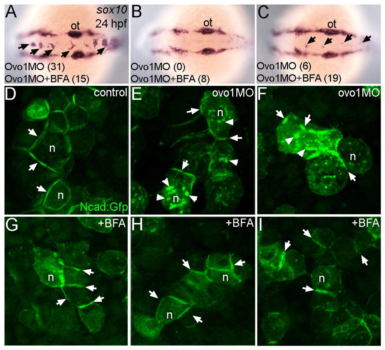 Fig. 6 Inhibition of intracellular trafficking rescues the Ovo1 morphant phenotype. (A-C) In situ hybridization for sox10 at 24 hpf. Dorsal views, anterior to the left. Percentages of embryos with NC cell aggregates at the dorsal midline (arrows) with or without BFA treatment are indicated at the bottom of each panel. (A) A severe example with >5 cells per aggregate over both the midbrain and hindbrain. (C) A less severe example with <5 cells per aggregate exclusively located over the hindbrain. (D-I) Ncad:Gfp injections. Ncad:Gfp localizes to the membranes (arrows) of untreated (D) and BFA-treated control cells (G). In Ovo1 morphant cells, Ncad:Gfp also accumulates in the cytoplasm (E,F; arrowheads), but is largely restored to the membrane in BFA-treated Ovo1 morphant cells (H,I). n, nucleus; ot, otic vesicle.