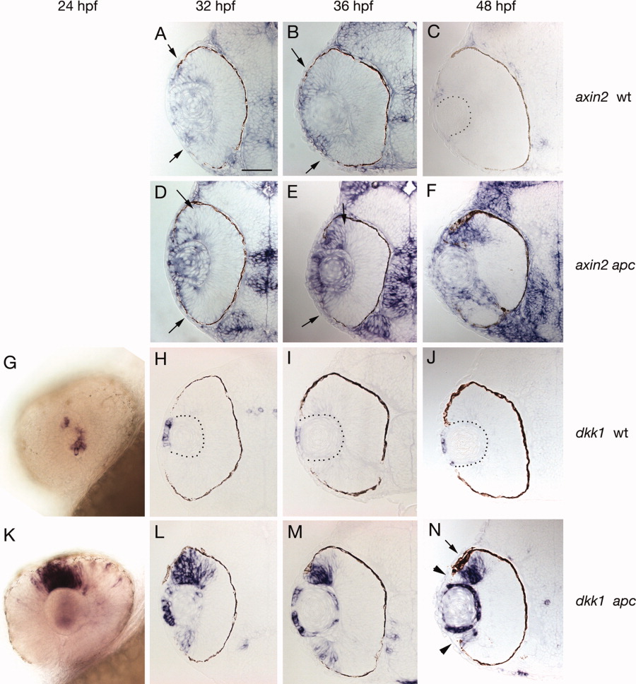 Fig. 1 Expression of Wnt/β-catenin pathway genes in wild-type and apc mutant eyes. A,B: In 32 and 36 hours postfertilization (hpf) wild-type (wt) eyes, axin2 is expressed in the lens and in peripheral cells of the eye (arrows indicate central border of expression). C: By 48 hpf, only a few most peripherally located cells express axin2. D,E: In 32 and 36 hpf apc mutant eyes, axin2 is up-regulated in cells that express axin2 in wt eyes. F: In 48 hpf apc mutant eyes, axin2 expression is expanded, as it fails to become restricted to only a few peripheral cells. Even in apc mutants axin2 is never activated in the central retina. G-J: in 24-48 hpf wt eyes, only cells in the anterior lens epithelium express the Wnt inhibitor and Wnt target dkk1. K: In contrast, in 24 hpf apc mutant eyes dkk1 is strongly up-regulated in dorsal peripheral regions of the retina. L-N: Beginning at 32 hpf, expression is also observed in the ventral retina. N: Between 36 and 48 hpf dkk1 is down-regulated in the most peripheral cells (arrowheads). Throughout all stages observed dkk1 is also up-regulated in the lens. The dorsal retinal pigmented epithelium is expanded adjacent to the Wnt/β-catenin activation domain (arrow).