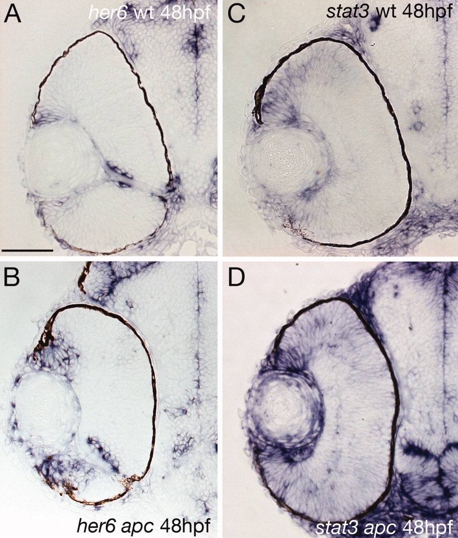Fig. 4 Wnt/β-catenin causes up-regulation of genes that inhibit neural differentiation. A: The transcriptional repressor her6 is expressed in the most peripheral cells in 48 hours postfertilization (hpf) wild-type eyes, as well as in cells surrounding the optic stalk. B: In apc mutant eyes, the her6 expression domain is expanded. C,D: her6 is likely a target of stat3 that is also up-regulated in apc mutant eyes.