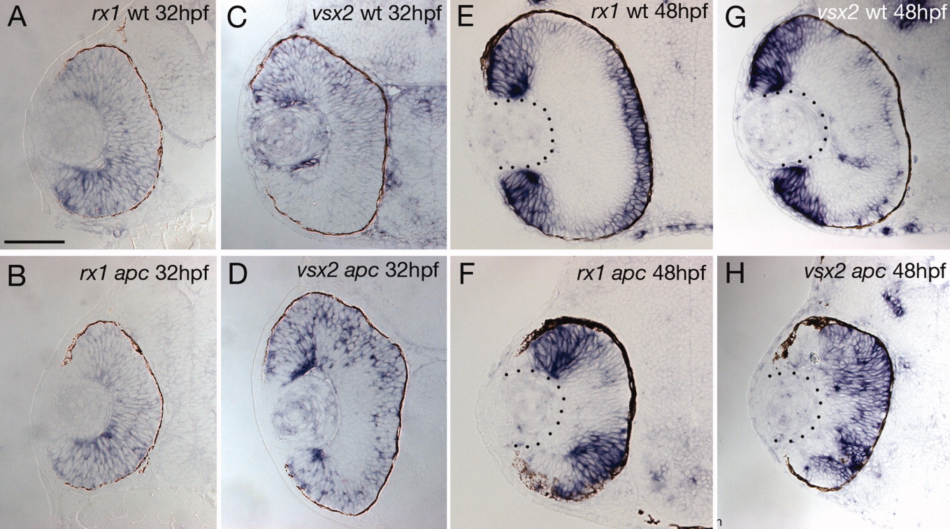 Fig. 5 Wnt/β-catenin signaling is not involved in the initiation of vsx2 and rx1 expression but affects their maintenance. A,B: At 32 hours postfertilization (hpf), rx1 is broadly expressed in wild-type and apc mutant eyes, even though Wnt/β-catenin target genes are already expanded at this stage. C,D: In 32 hpf wild-type eyes, vsx2 is more strongly expressed in all cells of the dorsal, whereas in apc mutant eyes, it is also present in the ventral domain (D). E: In 48 hpf wild-type eyes, rx1 is expressed in all peripheral cells, encompassing the otx1, sox2, and atoh7 domain, as well as differentiating photoreceptor cells. G: In 48 hpf wild-type eyes, vsx2 is expressed in an overlapping domain with the exception of photoreceptor cells. F,H: In 48 hpf apc mutant cells, rx1 and vsx2 are expressed in more central cells but are down-regulated in the expanded CMZ.