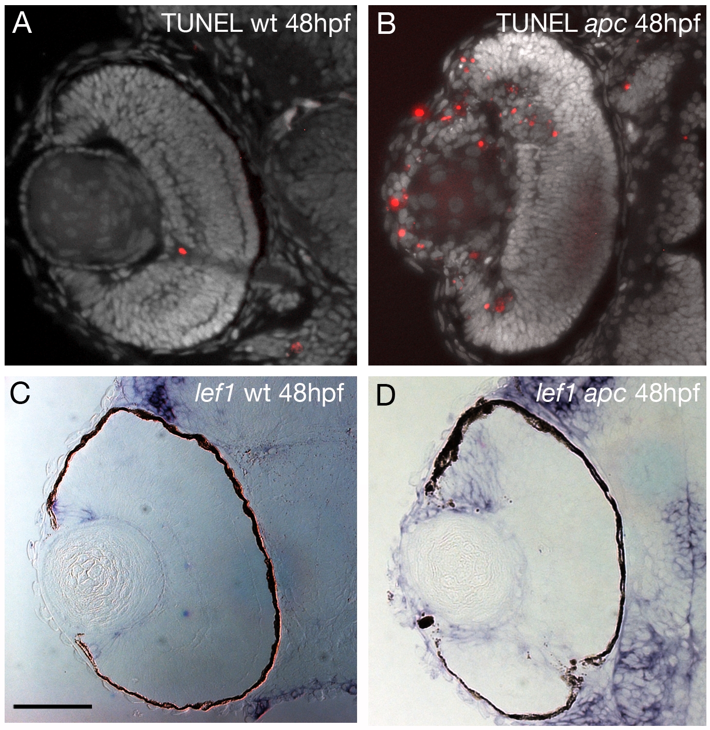 Fig. S1 Cell death is not responsible for gene expression changes in apc mutant eyes. A,B: TUNEL (terminal deoxynucleotidyl transferase-mediated deoxyuridinetriphosphate nick end-labeling) staining of 48 hours postfertilization (hpf) wild-type (A) and apc mutant (B) eyes. In apc mutant eyes, more cells are undergoing cell death than in wild-type eyes. C,D: In situ hybridization of 48 hpf p53 morpholino injected wild-type and apc mutant embryos with the Wnt/β-catenin pathway target lef1. D: Even in the absence of cell death, apc mutant eyes show an expansion of Wnt/β-catenin target gene expression.