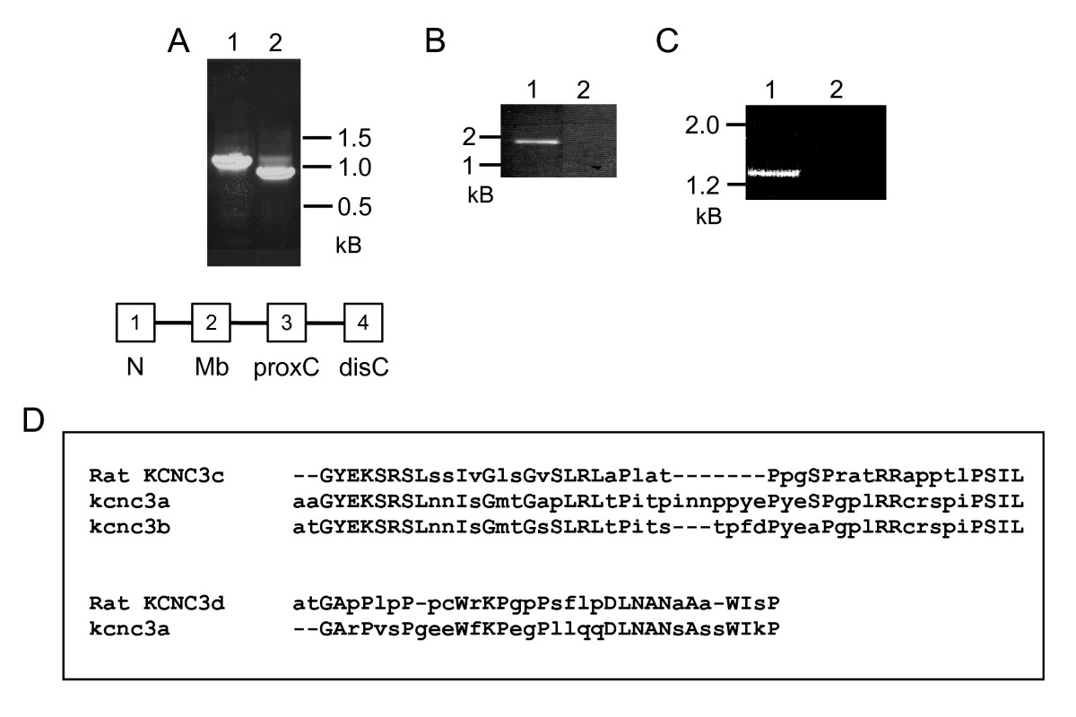 Fig. 4 Zebrafish contain two Kv3.3 genes. A) Properly-spliced products of the expected sizes are amplified by RT-PCR using kcnc3a- and kcnc3b-specific primers. Lane 1: Product of kcnc3a-specific primers in exons 1 and 2 as indicated in cartoon below gel, which shows the conserved genomic arrangement of Kv3 protein coding exons 1 (N terminus), 2 (S1-S6 membrane domain), 3 (proximal C terminus), and 4 (distal C terminus) (Table 1). Cartoon is not drawn to scale. Lane 2: Product of kcnc3b-specific primers in exons 2 and 3. B), C) Mixed primers from kcnc3a and kcnc3b fail to amplify products. Lanes 1: In B, product of kcnc3a-specific primers in exons 1 and 4 (specific for ′PSIL′ carboxyl terminus [see part D]); In C, product of kcnc3b-specific primers in exons 2 and 4. Lanes 2: In B, mixture of kcnc3a-specific primer in exon 1 and kcnc3b-specific primer in exon 4; In C, mixture of kcnc3b-specific primer in exon 2 and kcnc3a-specific primer in exon 4. Primer sequences are provided in additional file 2, Fig. S2. D) Distal carboxyl termini generated by alternative splicing of kcnc3a have been aligned with orthologous sequences from rat Kcnc3 gene. Identical residues are shown in caps. RT-PCR analysis indicates that both kcnc3a variants are expressed in embryonic zebrafish (data not shown). Both kcnc3a variants, ending in ′WIKP′ or ′PSIL′, were cloned for functional analysis. Only one exon encoding the distal carboxyl terminus of kcnc3b has been identified in Zv8. Accession numbers for rat splice variants: [GenBank:AY179603.1, GenBank:AY179604.1].