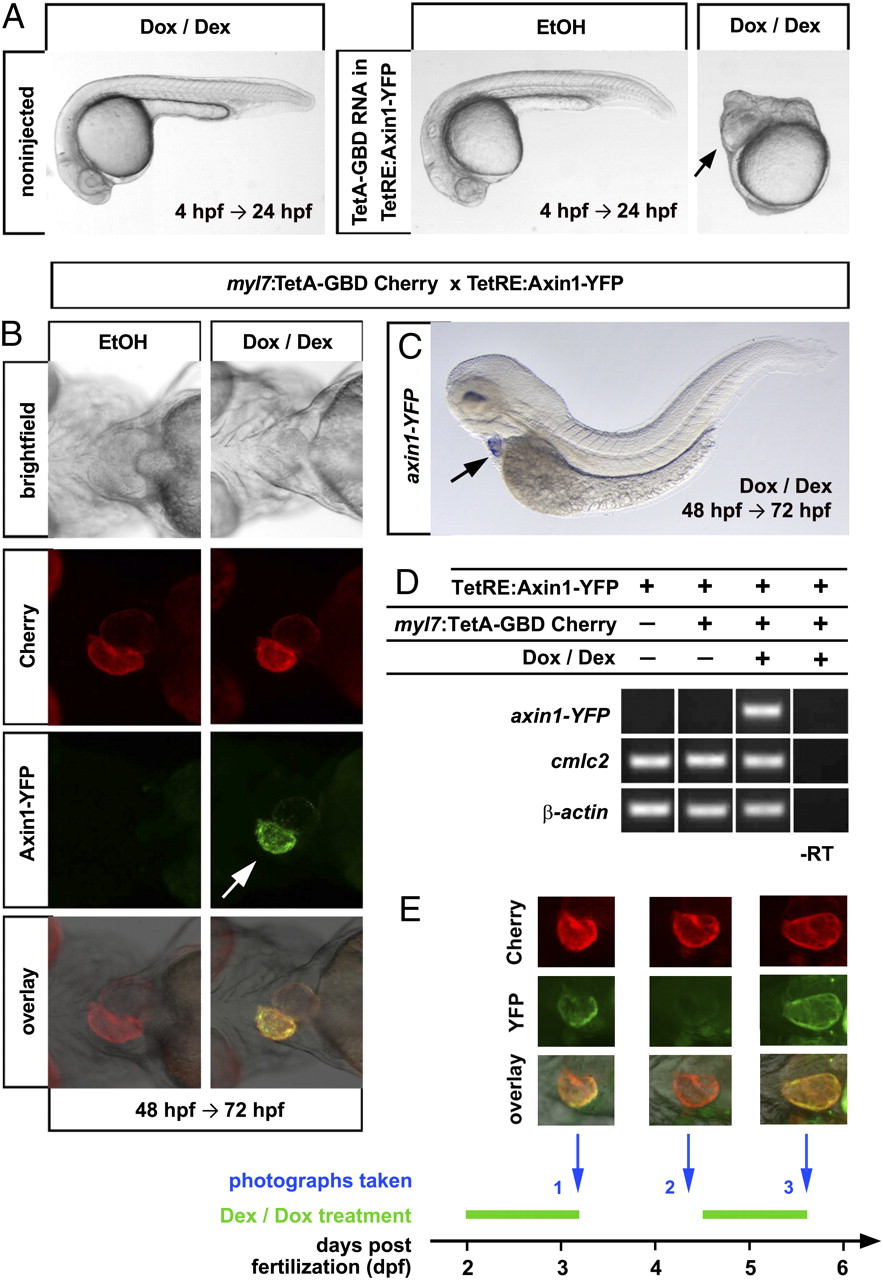 Tissue-specific, reversible gene expression using the dually inducible TetA-GBD/TetRE-tight system in embryonic and adult zebrafish. (A) Severe Wnt/β-catenin loss-of-function phenotypes as evidenced by posterior truncations and expanded eyes (arrow) in TetRE:Axin1-YFP embryos injected with 100 ng/μl TetA-GBD RNA and treated with Dox/Dex from 4 h postfertilization (hpf) until 24 hpf. Note that embryos treated with EtOH vehicle and noninjected embryos treated with Dox/Dex develop normally. n = 30 noninj, 7 EtOH, 9 Dox/Dex. (B) Induction of Axin1-YFP expression in ventricle (arrow) in myl7:TetA-GBD Cherry; TetRE:Axin1-YFP double transgenic embryos treated with Dox/Dex for 24 h from 48 hpf. n = 15 EtOH, 18 Dox/Dex. (C) Heart-specific induction of Axin1-YFP RNA (arrow) after Dox/Dex treatment. n = 15. (D) Semiquantitative PCR detects axin1-YFP expression only in myl7:TetA-GBD Cherry; TetRE:Axin1-YFP double transgenic embryos treated with Dox/Dex (lane 3), but not in EtOH treated embryos (lane 2) or embryos only containing the TetRE:Axin1-YFP transgene (lane 1). myl7 and β-actin are shown as loading controls. (E) Fast reversibility and reinducibility of Axin1-YFP induction. Fluorescent images of the heart of one individual myl7:TetA-GBD; TetRE:Axin1-YFP double transgenic embryo is shown that was treated with Dox/Dex and photographed at the times indicated. Note that YFP signal is not detectable 24 h after drug withdrawal (Middle, column 2) and reexpressed after additional 24 h of drug treatment (Middle, column 3). n = 5.