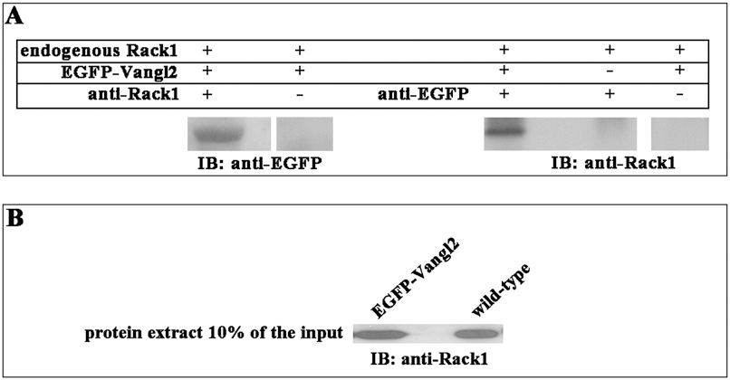 Fig. S4 Rack1 is associated with Vangl2 in zebrafish embryo extracts. RNA encoding EGFP-Vangl2 (200 pg) was injected into zebrafish embryos at the one- or two-cell stage. The embryos were collected from the bud stage (10 hpf) to 10-somite stage (14 hpf) and processed for yolk removal and protein extraction from the dissected EGFP-Vangl2–expressing embryos. Similarly, extracts were made from control embryos. (A) Coimmunoprecipitation experiments were performed as described. Note that EGFP-Vangl2 was pulled down only in the presence of Rack1 antibody and that Rack1 was coimmunoprecipitated only in the presence of EGFP-Vangl2 and EGFP antibody. (B) The protein extracts from the control and EGFP-Vangl2–injected embryos were loaded directly and blotted with an antibody against Rack1 as input controls.