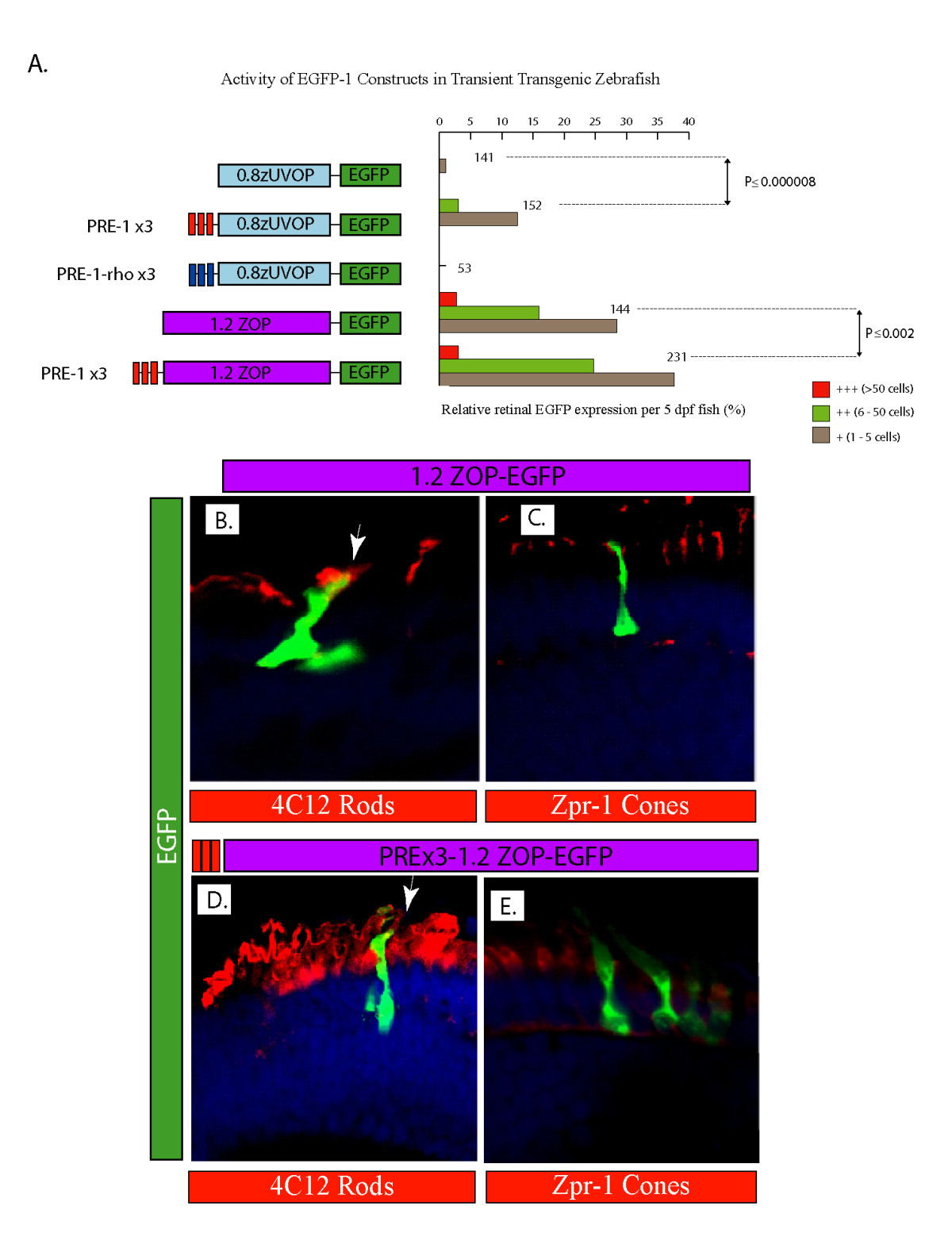 Fig. 5 PRE-1 is sufficient to enhance reporter expression from photoreceptor-specific promoters. A. Schematic of the promoter-reporter regions of chimeric constructs. Three copies of PRE-1 (red boxes) are sufficient to enhance expression from both cone and rod promoter fragments, whereas three copies of PRE-1-rho (navy boxes) are unable to enhance expression from the cone promoter fragment. Blue and purple rectangles represent zebrafish UV opsin and rhodopsin promoter fragments respectively, upstream of EGFP. B-E. Confocal micrographs of retinal sections from 5 dpf embryos injected with 1.2 kb ZOP-EGFP or (3x PRE-1)-1.2 kb ZOP-EGFP constructs and stained with 4C12 and zpr-1 antibodies. EGFP-positive cells co localize (arrows) with rod photoreceptors (4C12 antibody), but not with cone photoreceptors (zpr-1 antibody). Nuclei are counter-stained with DAPI.