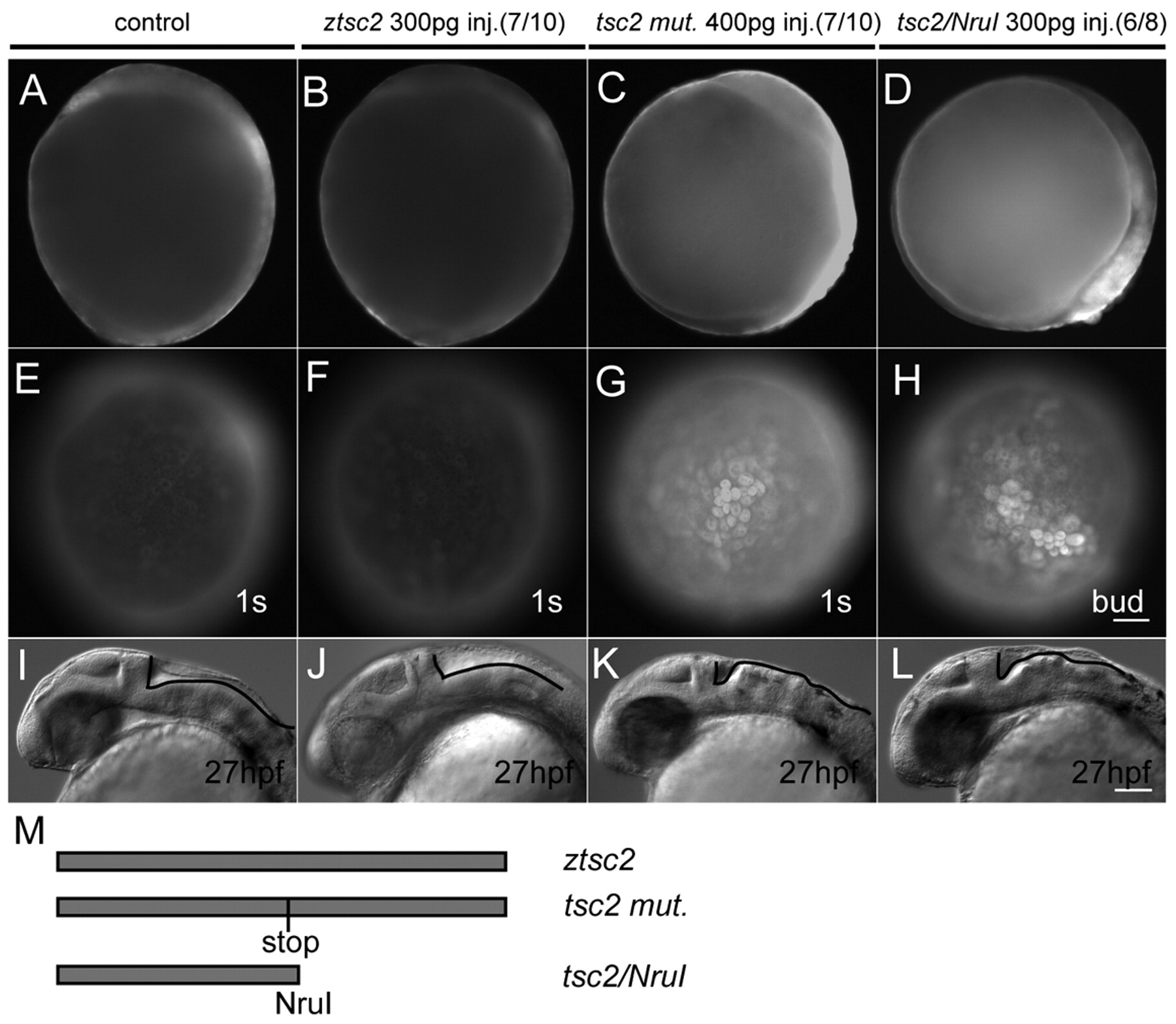 Fig. 3 Ectopic expression of truncated forms of Tsc2 increases TORC1 activity and causes morphological defects in the brain. (A–D) Lateral view of uninjected wild-type control (A), tsc2 wild-type RNA-injected (B), tsc2vu242 RNA-injected (C) and tsc2/NruI-truncated RNA-injected (D) embryos at the one-somite stage (10.3 hpf). Embryos were labeled with an antibody to phospho-S6 (A–H). (E–H) Dorsal view of A–D. (I–L) Lateral views (anterior to the left) of control (I), tsc2 RNA-injected (J), tsc2vu242 RNA-injected (K) and tsc2/NruI-truncated RNA-injected (L) embryos at 27 hpf. Solid lines mark the hindbrain boundary (I–L). (M) Schematic of constructs used for the production of synthetic RNAs for injection experiments. Scale bars: 100 μm.
