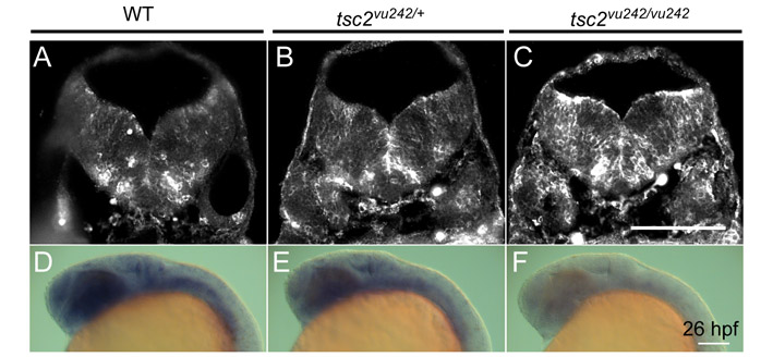 Fig. S5 Increased TOR activity and decreased tsc2 mRNA in tsc2vθ242/+ heterozygous and tsc2vθ242/vθ242 homozygous mutant zebrafish. Wild-type (A,D), tsc2vu242/+ heterozygous (B,E) and tsc2vu242/vu242 homozygous embryos at 26 hpf (C,F). Phospho-S6 staining in (A-C), whole mount in situ hybridization staining in (D-F). Scale bar equals 100 μm.