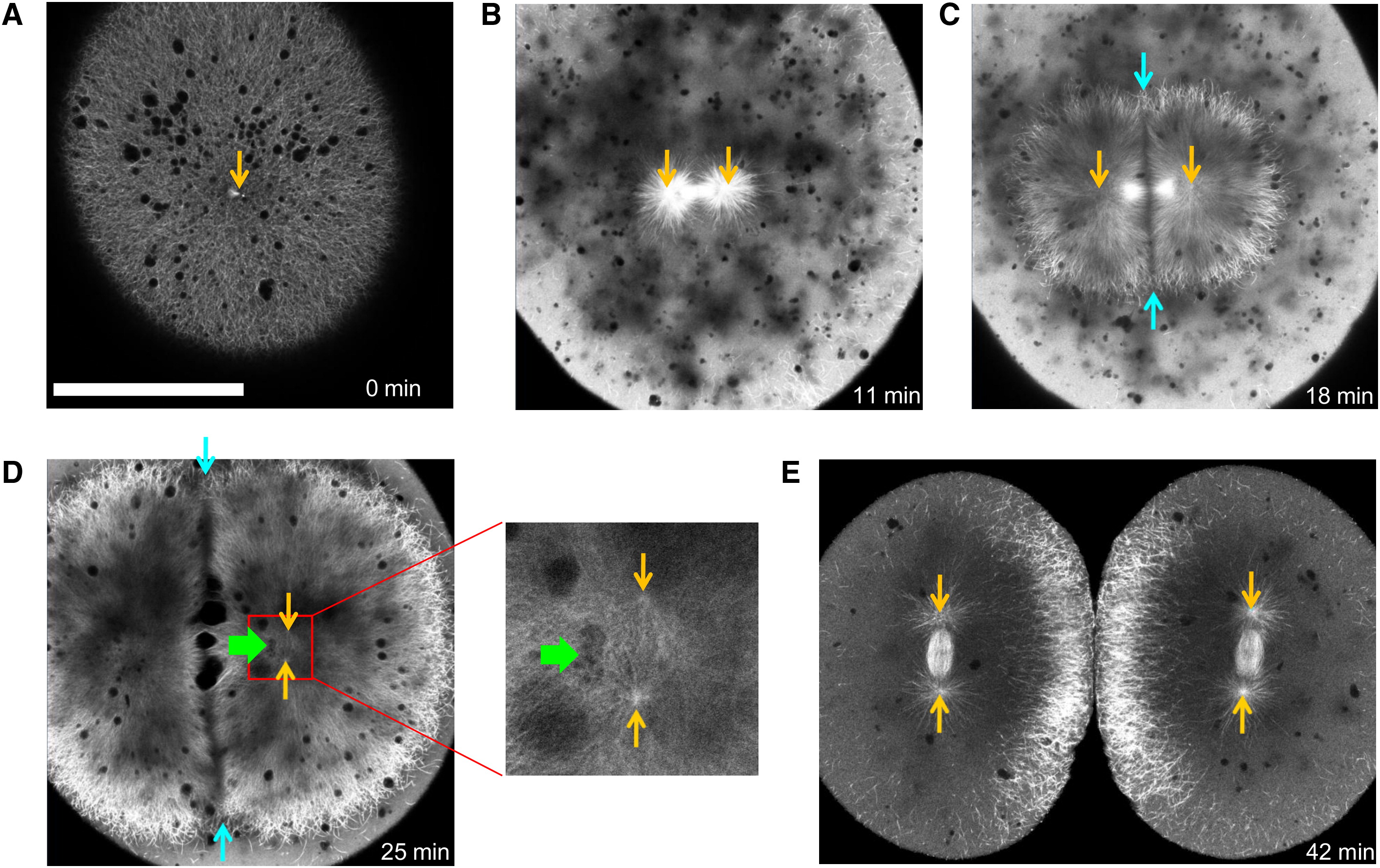 Orange arrows indicate positions of centrosomes.(A) Shortly after fertilization, sperm aster expands throughout the cell. The scale bar represents 200 μm.
