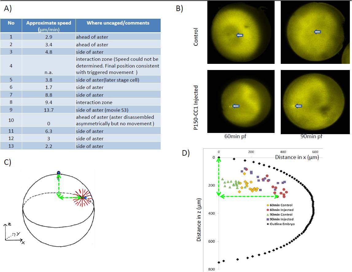 Fig. S3 Related to Figure 3. A) List of experiments in which microtubules were depolymerised locally in zebrafish embryos, together with the speed of aster movement. Speed was measured (approximately) by tracking the movement of fixed parts at the center of the aster (the centrosome or mid-body). Positive speeds indicate movement away from the irradiated zone. Movement towards the region of uncaging (which we did not observe) would have been reported as negative speed. In 12/13 experiments the aster moved away from the irradiated zone, in 1/13 it did not move and in no case was movement towards the zone observed. B-D) Sperm-aster in frog embryos depends on dynactin to move centrosome: Embryos were synchronously fertilized and fixed 60 and 90 min after fertilization. B) By staining against tubulin sperm aster formation and centrosome movement could be followed in p150-CC1 injected and control embryos. Arrow indicated position of centrosome. C) Because centrosome movement is three-dimensional, centrosome position was recorded relative to the animal pole at the top of the embryo. D) Centrosome position of injected and control embryos were plotted with circumference of one embryo. In control embryos centrosomes move from the periphery towards the cell’s center while p150-CC1 injected embryos centrosomes were located close to the cortex