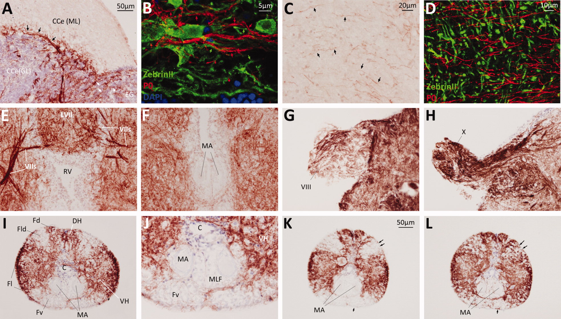 Myelin P0 expression in the hindbrain, cranial nerves, and spinal cord. Transverse sections of adult zebrafish hindbrain and spinal cord were labeled by immunohistochemistry to reveal P0 (A,C,E–L), or by immunofluorescence to detect P0 (red), Zebrin II (green) and nuclei (blue) (B,D). The bar in A shows the scale for A,E–I; the bar in C shows the scale for C,J; the bar in K shows the scale for K,L. A: Body of cerebellum. Black arrows indicate bundles of P0-immunoreactive fibers that appear to arise from the junction between the molecular and granule cell layers. White arrows indicate P0-expressing fibers that pass through the granular eminence. B: A single confocal plane is shown at the junction between the molecular and granule cell layers to illustrate the relationship between P0 immunoreactive fibers (red, red arrows) and Purkinje cells and their axons (green, green arrows). Nuclei of the granule cell layer (blue) are seen at the bottom of the image. C: Body of cerebellum. The neuropil of the molecular layer is shown. Black arrows show examples of the numerous single P0-immunoreactive fibers passing through the molecular layer. D: A single confocal plane of the molecular layer is shown to illustrate the relationship between P0 immunoreactive fibers (red) and Purkinje cell dendrites (green). E: Dorsal medulla. F: Ventral medulla. G: Cranial nerve VIII. H: Cranial nerve X. I–L: Spinal cord. Images K,L show adjacent sections that were labeled identically, except that the section shown in panel L was pretreated to remove myelin lipids before processing for immunohistochemistry. The black arrows show the regions in Fld and Fv that show enhanced P0 immunoreactivity following lipid solubilization.
