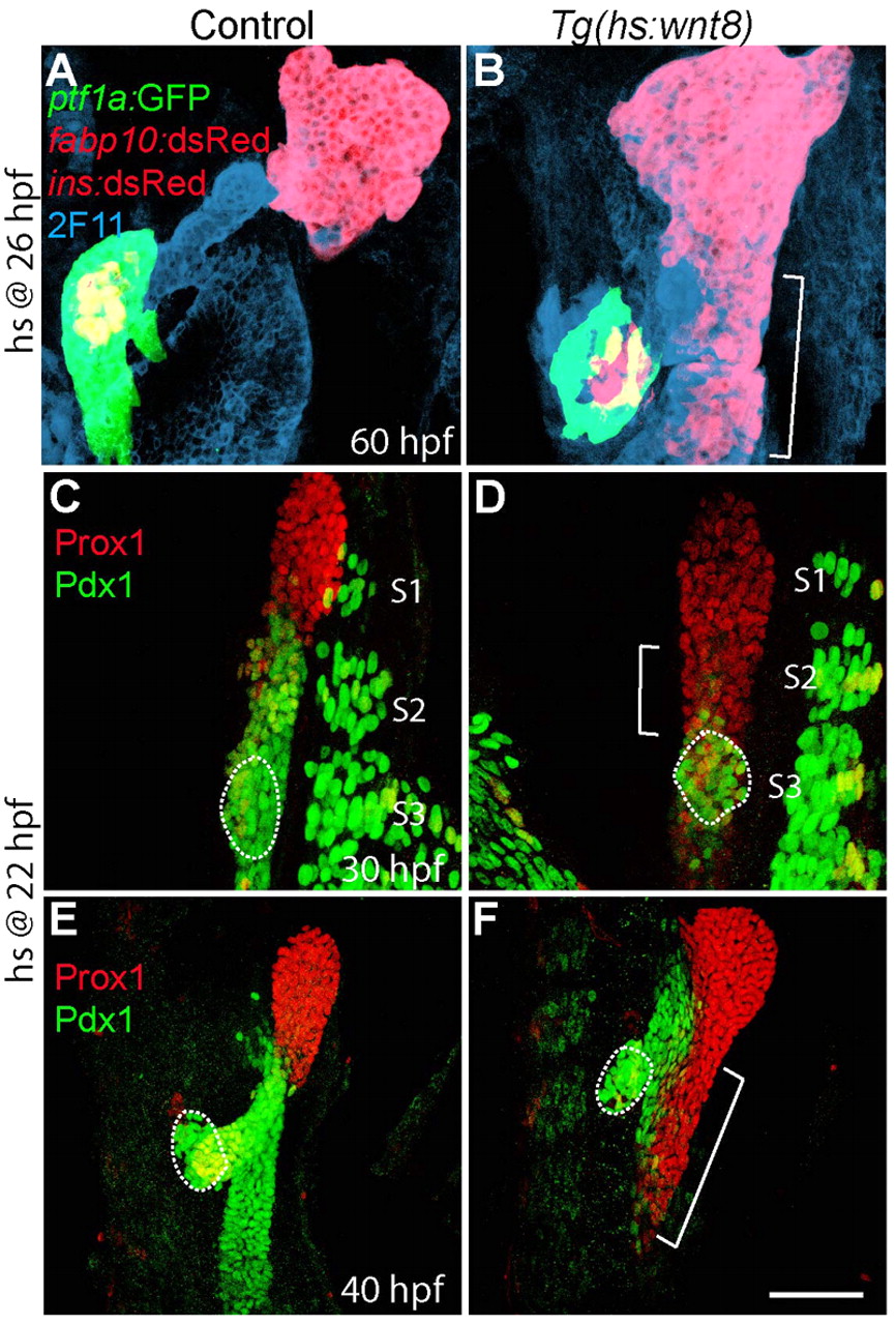 Wnt8a overexpression induces liver cells in the endoderm posterior to the liver. Embryos obtained from outcrossing Tg(hs:wnt8a) zebrafish were heat-shocked at 26 (A,B) or 22 (C-F) hpf, and processed for whole-mount immunostaining. (A,B) The Tg(fabp10:dsRed,ela3l:EGFP);Tg(ptf1a:eGFP);Tg(ins:dsRed) line was used to reveal hepatocytes (red), pancreatic acinar cells (green) and pancreatic β cells (red); mAb 2F11 staining reveals the hepatopancreatic duct (blue). The bracket marks the region with ectopic hepatocytes (n=7 out of 7). (C-F) Anti-Prox1 and anti-Pdx1 staining at 30 hpf (D; n=4 out of 4) reveals that Wnt8a overexpression induced Prox1 expression in endodermal cells located at the level of the second somite (S2) and blocked Pdx1 expression in these cells (the Pdx1 staining in the somites is due to non-reactivity as pdx1 is not expressed there). At 40 hpf, the endoderm posterior to the liver-forming region expressed Prox1 but not Pdx1 (F, bracket, n=4 out of 4). Dotted lines outline the dorsal pancreas, and S1-S3 represent the first, second and third somite, respectively. Ventral views, anterior up. Scale bar: 50 μm.