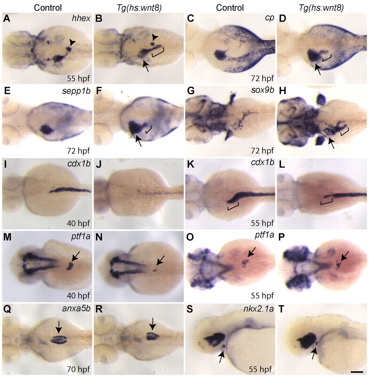 Wnt8a overexpression induces the expression of various hepatic markers and represses the expression of an intestinal and a ventral pancreatic marker. Embryos obtained from outcrossing Tg(hs:wnt8a) zebrafish were heat-shocked at 26 hpf and harvested at 40 (I,J,M,N), 55 (A,B,K,L,O,P,S,T), 70 (Q,R) or 72 (C-H) hpf for in situ hybridization. (A-H) Wnt8a overexpression induced the expression of the hepatoblast marker hhex (B, n=10 out of 10), the hepatocyte markers cp (D, n=14 out of 14) and sepp1b (F, n=12 out of 14), and the hepatic ductal marker sox9b (H, n=13 out of 13) in the endoderm (brackets) posterior to the liver (arrows). Arrowheads indicate the dorsal pancreas (A,B). (I-P) By contrast, Wnt8a overexpression initially repressed the expression of the intestinal marker cdx1b (J, n=17 out of 17) and the early ventral pancreatic marker ptf1a (N, arrow, n=18 out of 18), but later their expression recovered (L,P), except for cdx1b expression in the intestinal bulb region (L, bracket, n=10 out of 10). Arrows in M-P point to the ventral pancreas or its progenitor cells. (Q-T) However, Wnt8a overexpression did not appear to affect the expression of other endodermal markers such as the swim bladder marker anxa5b (R, arrow, n=13 out of 13) or the thyroid marker nkx2.1a (T, arrow, n=10 out of 10). Arrows point to the swim bladder (Q,R) or thyroid (S,T). Dorsal (A-R) or side (S,T) views, anterior to the left. Scale bar: 100 μm.