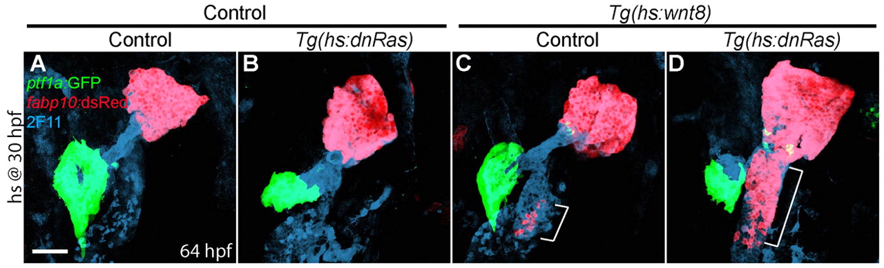 Blocking Ras function greatly enhances ectopic hepatocyte formation induced by Wnt8a overexpression. (A-D) Embryos obtained from crossing Tg(hs:wnt8a) with Tg(hs:dnRas) zebrafish were heat-shocked at 30 hpf, and harvested at 64 hpf for whole-mount immunostaining. Overexpression of dnRas did not induce ectopic hepatocytes or affect liver size in controls (B, n=5 out of 5), but it greatly enhanced ectopic hepatocyte formation induced by Wnt8a overexpression [D (n=7 out of 7) versus C (n=8 out of 8), brackets]. Ventral views, anterior upwards. Scale bar: 50 μm.