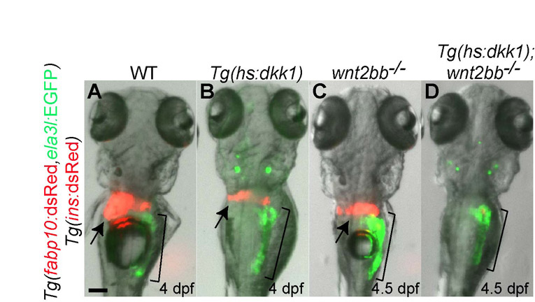 Wnt/β-catenin signaling is essential for liver formation. (A-D) The Tg(fabp10:dsRed,ela3l:EGFP) line was used to reveal hepatocytes (red) and acinar pancreatic cells (green). The liver formed in most Tg(hs:dkk1) embryos that were heat-shocked at 18 hpf (B; n=21 out of 24) and in most wnt2bb mutants (C; n=460 out of 506), although liver size was smaller than wild type. However, the liver did not form in most Tg(hs:dkk1);wnt2bb-/- embryos heat-shocked at 18 hpf (D; 86%, n=50 out of 58). Arrows indicate the liver; brackets mark the extent of the pancreas. Dorsal views, anterior upwards. Scale bar: 100 μm.