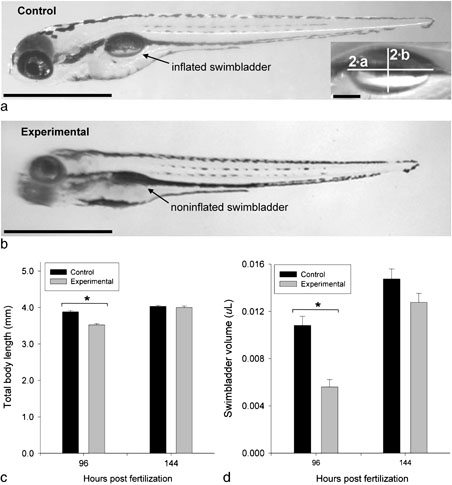 Effects of SMG on swimbladder morphology, total body length, and swimbladder volume during development. a, b: Representative photomicrographs of left lateral views of larvae with inflated swimbladders from control (a) and larvae with uninflated swimbladders from experimental (b) groups at 96 hpf. Inset shows magnified view of single-chambered swimbladder with the long (2*a) and short (2*b) axes marked for volumetric analysis, as modeled by a rotary prolate ellipsoid (see text). In b, the arrow marks the position of the uninflated swimbladder in larvae exposed to SMG. In all images of swimbladder in this and subsequent figures, cranial is to the left and dorsal is upward. c: Plots of total body length of larvae from control (black bars: n = 42) and experimental (gray bars: n = 70) groups measured at 96 and 144 hpf (control: n = 17; experimental: n = 18). d: Plots of swimbladder volumes estimated from animals that had inflated swimbladders at 96 hpf (control: n = 26; experimental: n = 10) and 144 hpf (control: n = 17; experimental: n = 18) with bar shading as in c. Asterisk (*) indicates a significant difference (independent samples t-test, P<0.001) in mean values between groups at the same time point. In panels a and b, scale bars represent 1.0 mm; in inset, 100 μm.