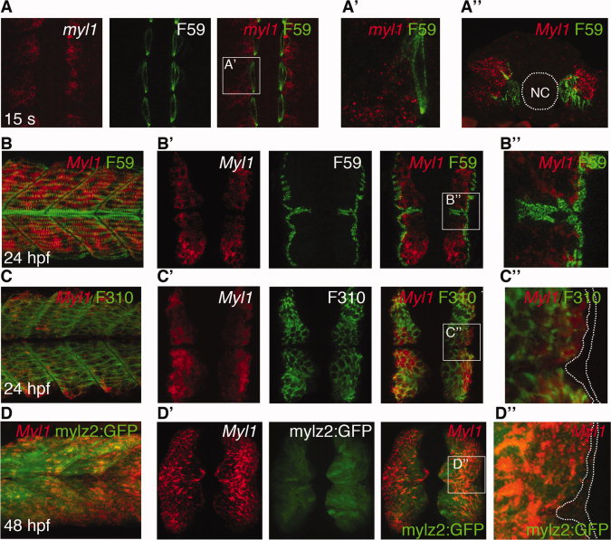 Fibre-type specific expression of myl1. A: Expression of myl1 (red) was detected in the fast domain of the paraxial mesoderm in a 15-somite-stage flat-mounted embryo using fluorescent in situ hybridisation. Labelling of adaxial cells/slow fibres using F59 antibody (green) showed no overlap with the myl1 staining. A2: Blow-up of a single somite as indicated by square in A. A3: Transverse section of 15-somite-stage embryo. NC, notochord. Labelling of adaxial cells/slow fibres using F59 antibody (green) showed no overlap with the myl1 staining. B: Lateral view of 24-hpf embryo stained with F59 antibody (green), labelling slow fibers and myl1 antisense probe (red). B2: Transverse sections of 24-hpf embryo where slow fibres, detected with F59 antibody (green), showed no co-localisation with myl1 antisense probe (red). B3: Blow-up of region boxed in B2. C: Lateral view of 24-hpf embryo where F310 antibody (green) labelling fast fibres is detected in myl1-positive fibres (red). C2: Transverse sections of 24-hpf embryo where fast fibres detected with F310 antibody (green) co-localised with myl1 antisense probe (red). C3: Blow-up of region boxed in C2. D: Lateral view of 48-hpf Tg(mylz2:GFP)i135 transgenic embryo where GFP+ fast fibres were co-labelled with myl1 antisense probe (red). D2: Transverse sections of 48-hpf Tg(mylz2:GFP)i135 transgenic embryo where GFP+ fast fibres were co-labelled with myl1 antisense probe (red). D3: Blow-up of region boxed in D2.