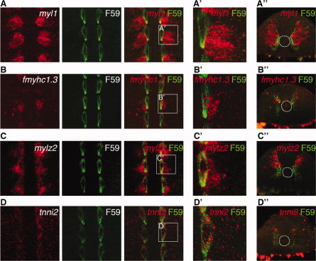 myl1 is the only skeletal fast muscle marker restricted to the skeletal fast muscle domain at 12-somite stage. A: Expression of myl1 (red) is excluded from F59-positive adaxial cells (green) and is specific to the fast domain at 12-somite stage. A2: Blow-up of region boxed in A. A3: Transverse section of 12-somite-stage embryo. B: fmyhc1.3 (red) is co-expressed with F59-positive adaxial cells (green) and is non-specific to the fast domain at 12-somite stage. B2: Blow-up of region boxed in B. B3: Transverse section of 12-somite-stage embryo. C: mylz2 (red) is co-expressed with F59-positive adaxial cells (green) and is non-specific to the fast domain at 12-somite stage. C2: Blow-up of region boxed in C. C3: Transverse section of 12-somite-stage embryo. D: tnni2 (red) is co-expressed with F59-positive adaxial cells (green) and is non-specific to the fast domain at 12-somite stage. D2: Blow-up of region boxed in D. D3: Transverse section of 12-somite-stage embryo.