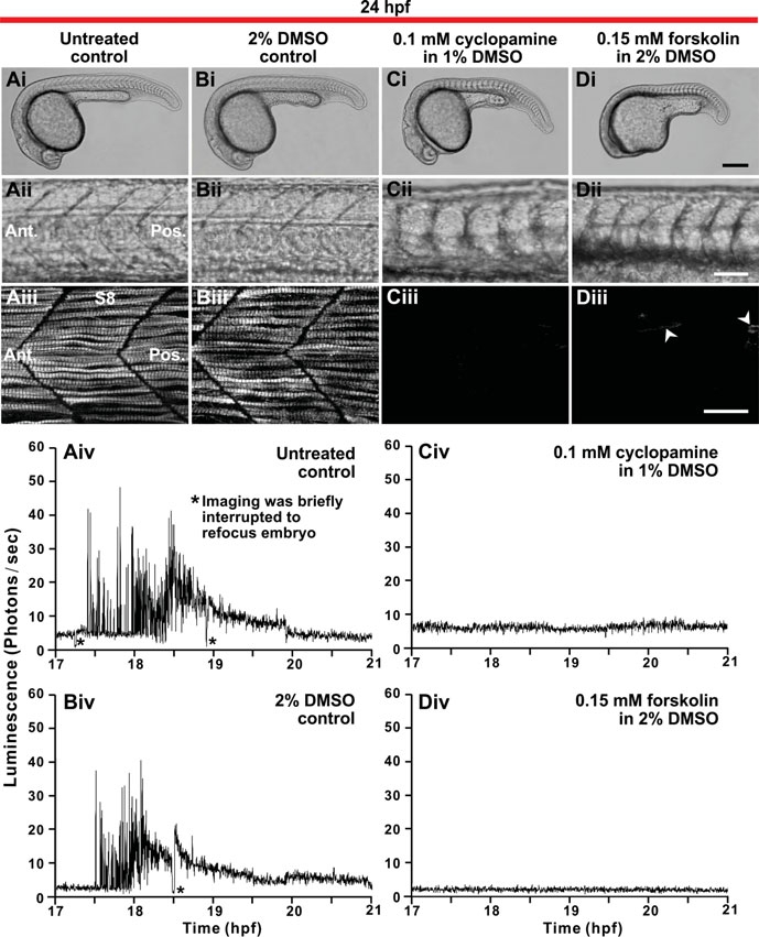 Effect of cyclopamine and forskolin on slow muscle development and Ca2+ signaling in the trunk. (Ai to Di) Representative bright-field images of embryos at 24 hpf that were either (Ai) untreated (controls), or else that were treated from 5.5 hpf with (Bi) 2% DMSO (DMSO-control), (Ci) 0.1 mM cyclopamine or (Di) 0.15 mM forskolin (n=4 for each of the untreated and drug-treated embryos). (Aii-Dii) The somites of the embryos shown in (Ai-Di), respectively, are shown at higher magnification. (Aiii-Diii) Projected stacks of confocal images through the trunk (at the position of somite 8; S8) of embryos treated as described for (Ai-Di), respectively, prior to fixation at 24 hpf and then the SMCs labeled by immunohistochemistry with the F59 myosin heavy chain antibody. Arrowheads in (Diii) indicate the few SMCs that still formed in the forskolin-treated embryos. Ant. and Pos. are anterior and posterior, respectively. Scale bars are (Ai-Di) 250 μm, (Aii-Dii) 50 μm and (Aiii-Diii) 25 μm. (Aiv-Div) Profiles of aequorin-generated light from α-actin-aeq transgenic embryos treated as described for (Ai-Di), respectively, from 17 hpf to 21 hpf (i.e., the ~16- to 24-somite stage). Data were plotted every 10 s, each data point representing 10 sec of accumulated luminescence for an ROI covering the entire embryo (i.e., 1.24 mm2).