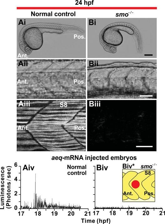 Slow muscle development and Ca2+ signaling in the trunk of smo-/- mutant embryos. (Ai,Bi) Representative bright-field images of (Ai) normal control (n=3) or (Bi) smo-/- mutant embryos (n=3), at 24 hpf. (Aii,Bii) The somites of the embryos shown in (Ai,Bi), respectively, are shown at higher magnification. (Aiii,Biii) Projected stacks of confocal images through the trunk (at the level of somite 8; S8) of (Aiii) normal control and (Biii) smo-/- mutant embryos that were fixed at 24 hpf and then the SMCs labeled by immunohistochemistry with the F59 myosin heavy chain antibody. Ant. and Pos. are anterior and posterior, respectively. Scale bars are (Ai,Bi) 250 μm, (Aii,Bii) 50 μm and (Aiii,Biii) 25 μm. (Aiv,Biv) Profiles of aequorin-generated light from aeq-mRNA injected (Aiv) normal (control) and (Biv) smo-/- mutant embryos from ~17 hpf to ~21 hpf (i.e., the ~16- to 24-somite stage). Data were plotted every 10 s, with each data point representing 10 sec of accumulated luminescence for an ROI covering ~8000 μm2 on somite 8 (Biv*).